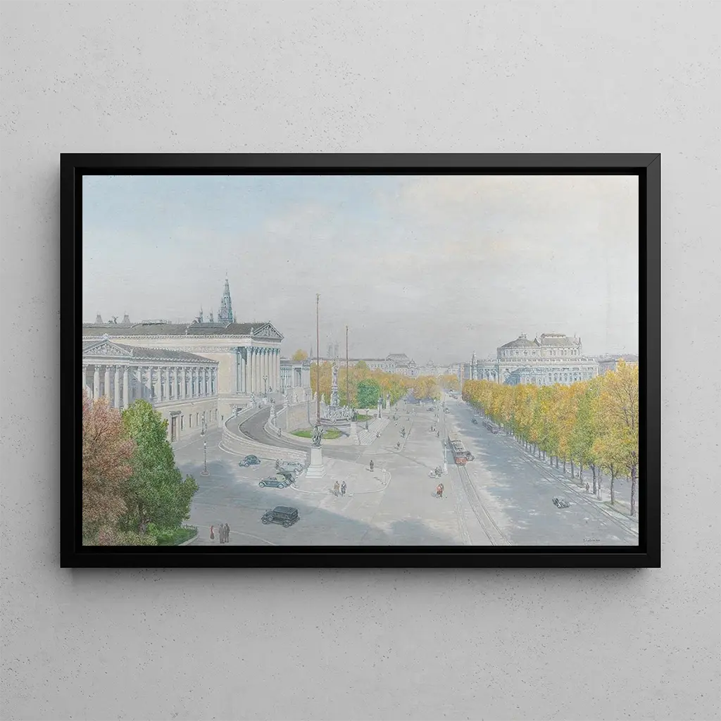 "Ringstraße with Parliament and Burgtheater" is a piece that captures the very essence of Viennese architecture. The canvas depicts the majesty of the iconic buildings lining this famous avenue, with particular attention to architectural details. The vibrant colors and play of light create a lively, almost tangible atmosphere, where one can almost hear the whisper of the city. The painting technique used, likely oil, allows for the richness of textures and shadows to be rendered, offering a dynamic view of this emblematic thoroughfare.