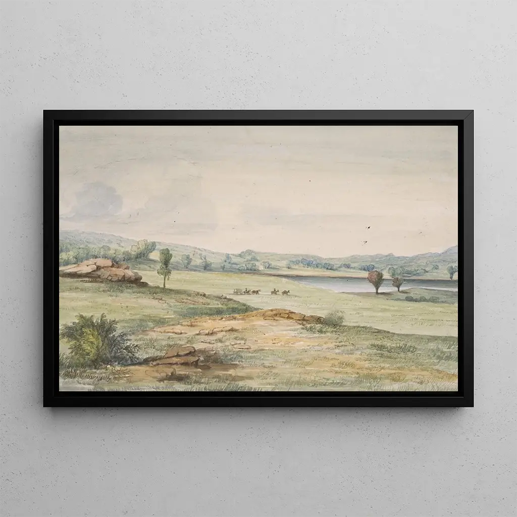 The art print of the River Sauk immerses us in a calming natural landscape, where shades of green and blue blend harmoniously. John Mix Stanley, with his oil painting technique, manages to capture the daylight dancing on the calm waters of the river. The meticulous details of the trees and mountains in the background add depth to the composition, inviting the viewer to escape into this idyllic scene. The atmosphere conveyed by this piece evokes an almost tangible tranquility, conducive to contemplation and daydreaming.