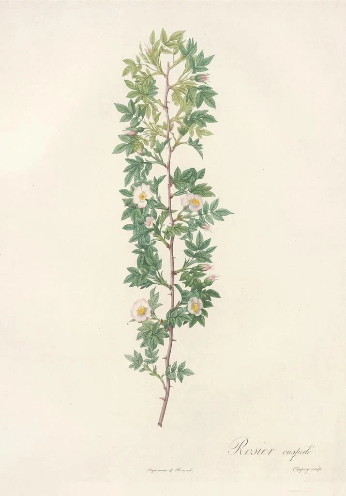 The art print of Rosa Aciphylla, created by Pierre Joseph Redouté, immerses us in a botanical universe of rare beauty. This painting, with its shades of tender green and its petals of a dazzling white, evokes the lightness and grace of flowers. The watercolor technique, mastered by Redouté, captures the subtleties of shadows and lights, giving the artwork an almost ethereal atmosphere. Every detail, from the veins of the leaves to the contours of the flowers, is carefully observed, demonstrating a passion for nature and a desire to depict it with precision.