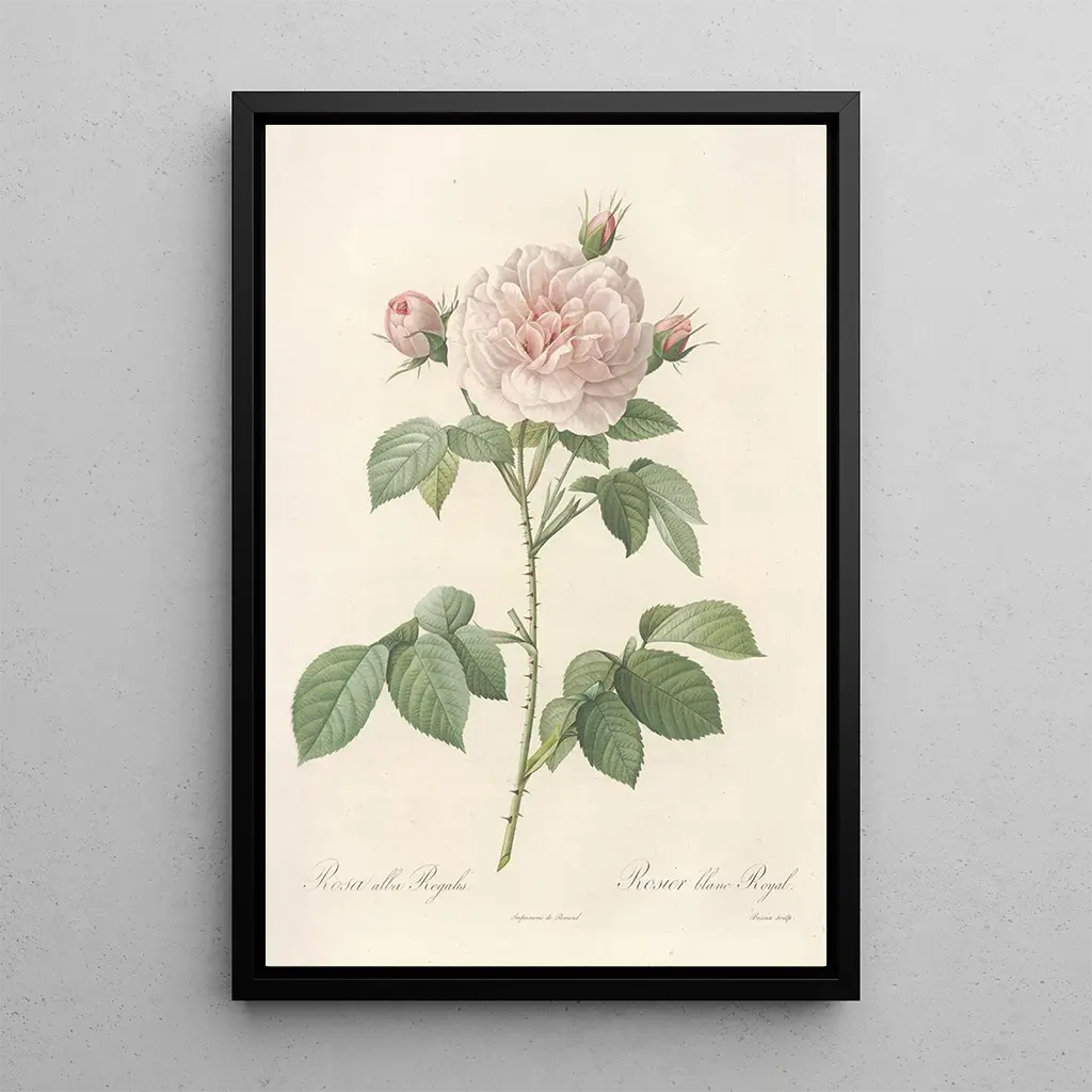 Pierre Joseph Redouté, active in the 18th century, is recognized as one of the greatest botanical illustrators of his time. Born in Belgium, he quickly made a name for himself at the French court, where he became the painter of Marie-Antoinette’s flowers. His style, blending scientific rigor and artistic sensitivity, made him a pioneer in the field of floral illustration. Rosa Alba Regalis, like many of his works, demonstrates his talent for capturing the natural beauty of roses while respecting their botanical structure. His influence endures, inspiring many artists and botanists.