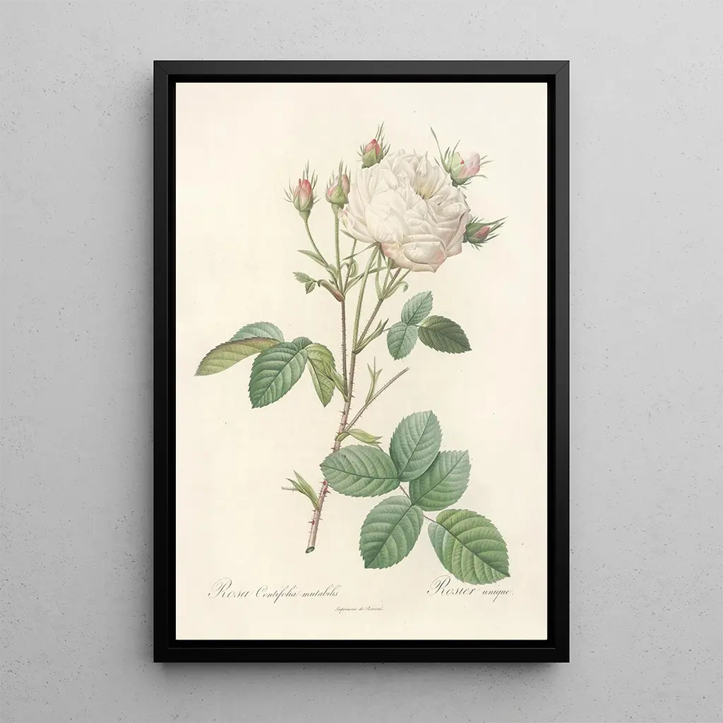 Pierre Joseph Redouté, born in 1759, is recognized as one of the greatest botanical artists of his time. His career in Paris, where he was the court’s flower painter, allowed him to forge an unparalleled reputation. Influenced by neoclassicism and the scientific advances of his era, Redouté captured the beauty of plants with unique precision and sensitivity. Rosa Centifolia Mutabilis is one of his masterpieces, illustrating his talent for representing nature while respecting botanical details. His work continues to inspire botanical and art enthusiasts.