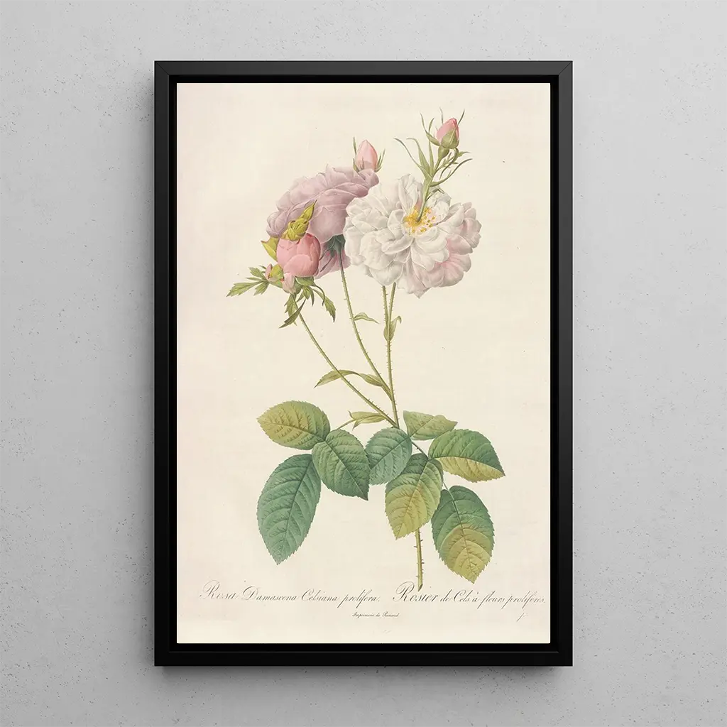 Pierre Joseph Redouté, an emblematic figure of the 18th century, is renowned for his exceptional talent in depicting flowers. His work, influenced by the botanical advances of his time, was widely appreciated at the French court, where he created numerous works for Queen Marie-Antoinette. Redouté mastered the art and science, making his watercolors references in botany. Rosa Damascena Celsiana Prolifera is a perfect example of his craftsmanship, illustrating the beauty of roses with unmatched precision and delicacy.