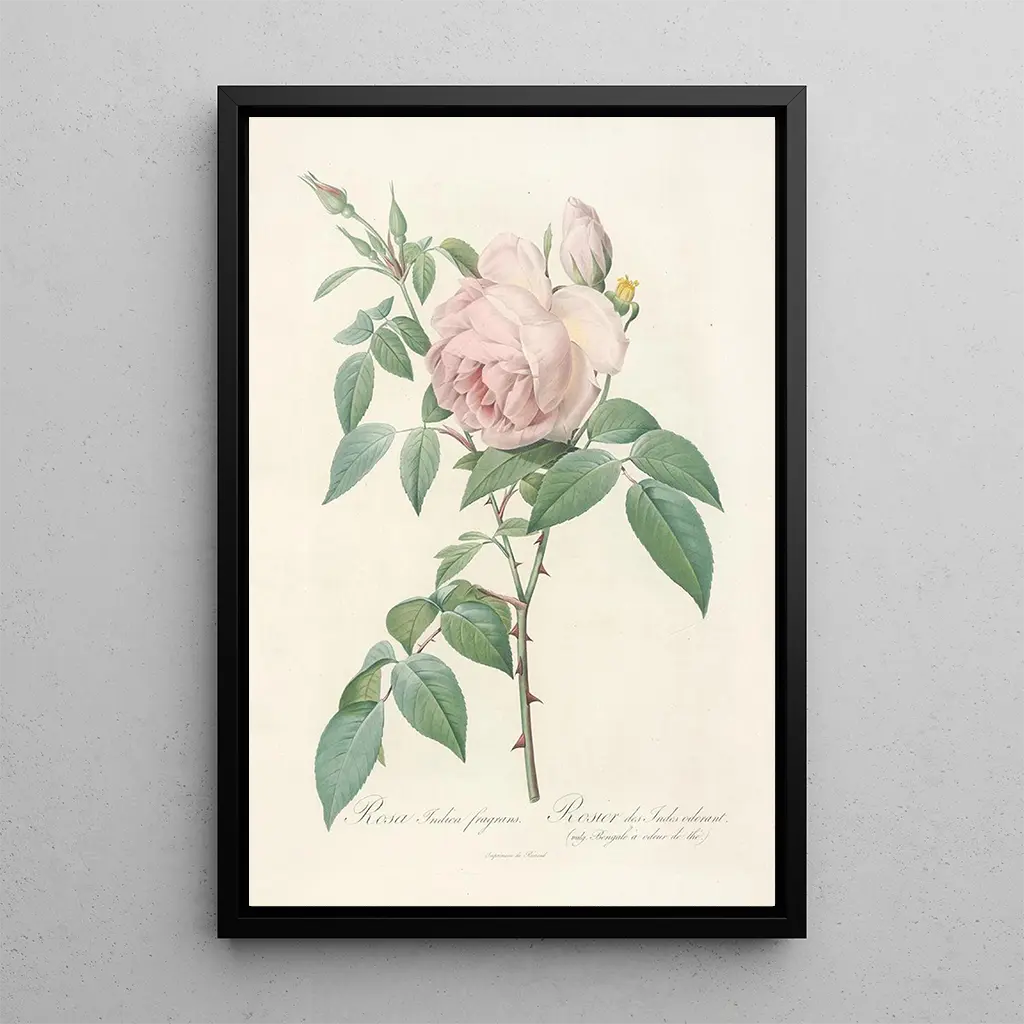Rosa Indica Fragrans: A tribute to floral beauty The art print of Rosa Indica Fragrans immerses us in a delicate universe where nature blossoms in all its splendor. The petals, in a soft pink, unfold gracefully, while the shades of green in the leaves create a harmonious contrast. The watercolor technique, mastered by Pierre Joseph Redouté, gives this artwork a lightness and transparency that evoke the gentle spirit of spring. The atmosphere emanating from this canvas invites contemplation and wonder at the ephemeral beauty of flowers. Pierre Joseph Redouté: the painter of flowers in the service of science Pierre Joseph Redouté, nicknamed the "Raphael of flowers," was a Belgian artist of the 18th century whose work left a mark on the history of botanical art. Trained in the school of observation, he skillfully combined scientific precision with artistic sensitivity. His works, often created for botanical publications, reflect his love for nature and his desire to depict it faithfully. Redouté was influenced by the neoclassical and romantic currents of his time, and his legacy endures through his art prints, which continue to inspire botanical and art enthusiasts. A decorative acquisition with multiple advantages The art print of Rosa Indica Fragrans is an ideal choice to enhance your interior, whether in a living room, office, or bedroom. Its print quality and fidelity to the original colors make it a captivating piece that draws the eye. By integrating this art print into your decor, you bring a touch of nature and serenity to your space. Its aesthetic appeal and timeless elegance make it a centerpiece that will delight your guests and enrich your daily environment.