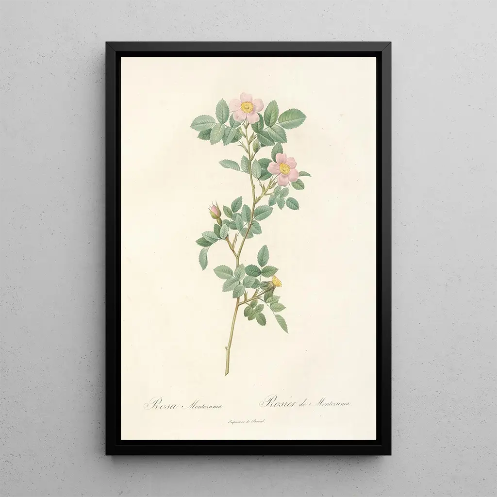 The art print of Rosa Montezuma is a true celebration of floral richness, highlighting vibrant hues and elegant shapes. This piece, created with exceptional precision, evokes the majesty of the rose, a symbol of love and beauty. The bright colors, ranging from deep red to delicate pink, are enhanced by detailed touches that capture the light in a fascinating way. The watercolor technique, used by Pierre Joseph Redouté, gives this canvas a lightness and fluidity that invite wonder and admiration.