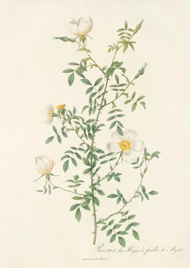 Pierre Joseph Redouté, nicknamed the "Raphael of flowers," skillfully combined art and science in the 18th century. Originating from Belgium, he settled in Paris where he was influenced by neoclassical currents and botanical gardens of his time. Redouté worked for court personalities, which contributed to his fame. His works, including Rosa Sepium Myrti Folia, are not only artistic representations but also precise botanical studies. Through his paintings, he enabled a better understanding of plants, elevating floral painting to an unparalleled level of excellence.