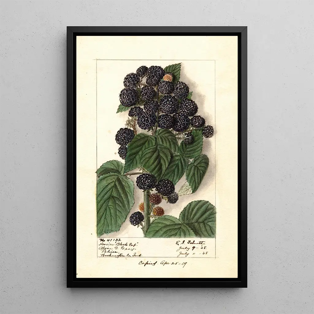 Rubus Hoosier Black Cap : a celebration of wild flavors The art print Rubus Hoosier Black Cap by Ellen Isham Schutt evokes the richness of black berries, with deep hues and delicate shadows that bring this work to life. The meticulous details of the fruits, almost tangible, are highlighted by a subtly blurred background that enhances their brilliance. The harmonious composition and skillful use of light create an atmosphere that is both lively and soothing. This canvas invites the viewer to immerse themselves in a world of flavors and sensations, where each berry seems ready to be picked. Ellen Isham Schutt : botanical art by a woman Ellen Isham Schutt, a prominent figure in botanical painting at the end of the 19th century, distinguished herself with her distinctive style and attention to detail. Operating in a context where representations of nature were gaining prominence, she was influenced by the scientific discoveries of her time, seeking to combine art and knowledge. Her work highlights the beauty of plants and fruits, while demonstrating a unique sensitivity. Schutt thus contributed to the rise of floral art, leaving a legacy that continues to inspire artists today. A decorative acquisition with multiple advantages The art print of the painting Rubus Hoosier Black Cap is a perfect choice to enhance your interior decor. Whether in a living room, office, or bedroom, this canvas adds a touch of nature and freshness to your space. Its printing quality ensures remarkable fidelity to the colors and details of the original work, while offering undeniable aesthetic appeal. By integrating this art print into your decor, you create a warm and welcoming environment where the beauty of nature is showcased.