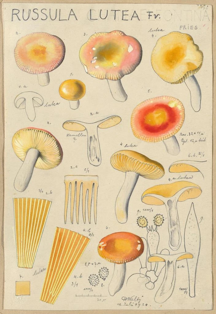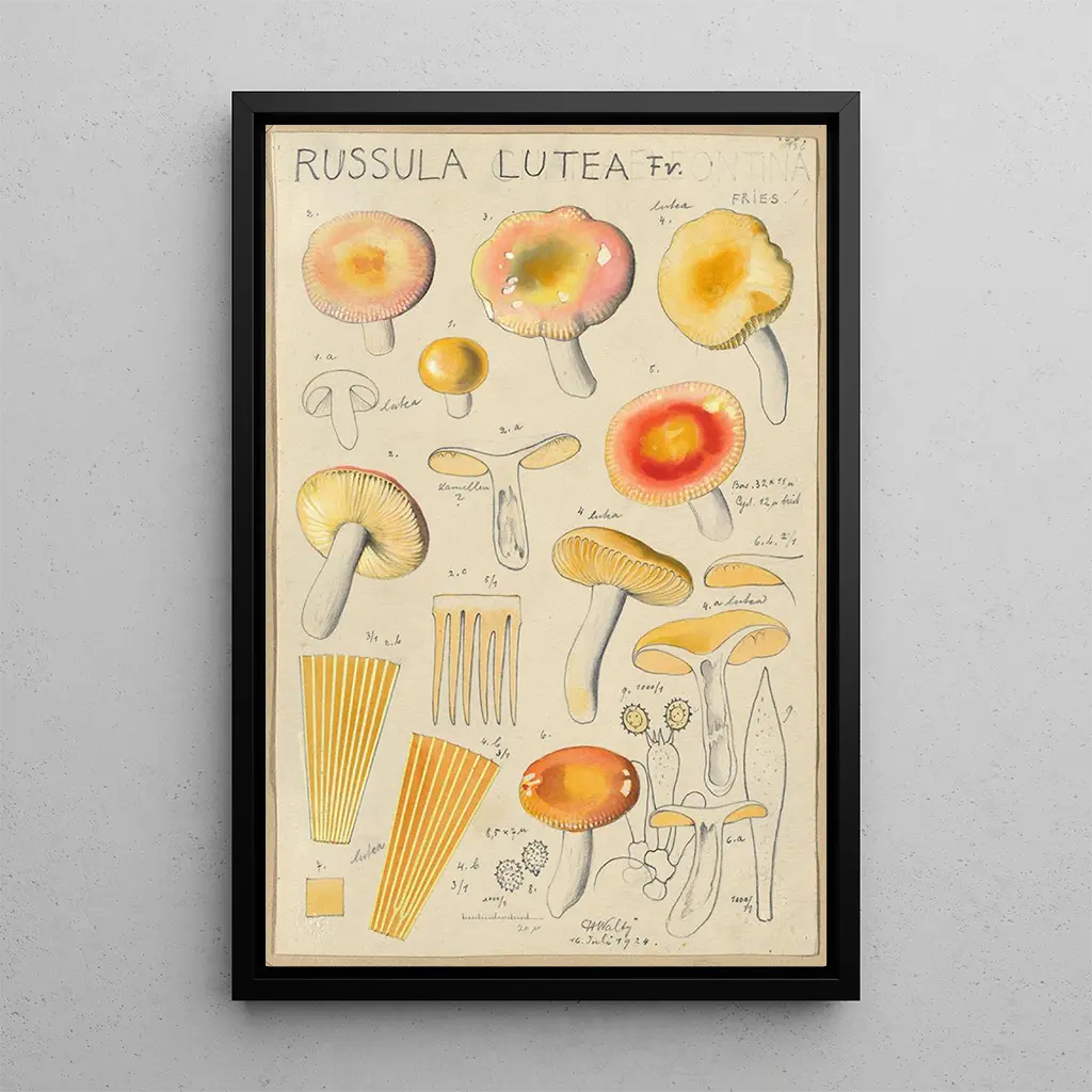 In this captivating art print, Hans Baldung invites us to explore the fascinating universe of fungi through his depiction of Russula lutea. The vibrant shades of yellow and orange, combined with hints of green, create an atmosphere that is both lively and mysterious. Baldung's technique, blending realism and stylization, brings this mushroom to life, placing it at the center of a composition that evokes the richness of nature. Every detail, from delicate contours to subtle shadows, demonstrates the artist's skill in capturing the essence of his subject, while inviting the viewer to a deep contemplation.