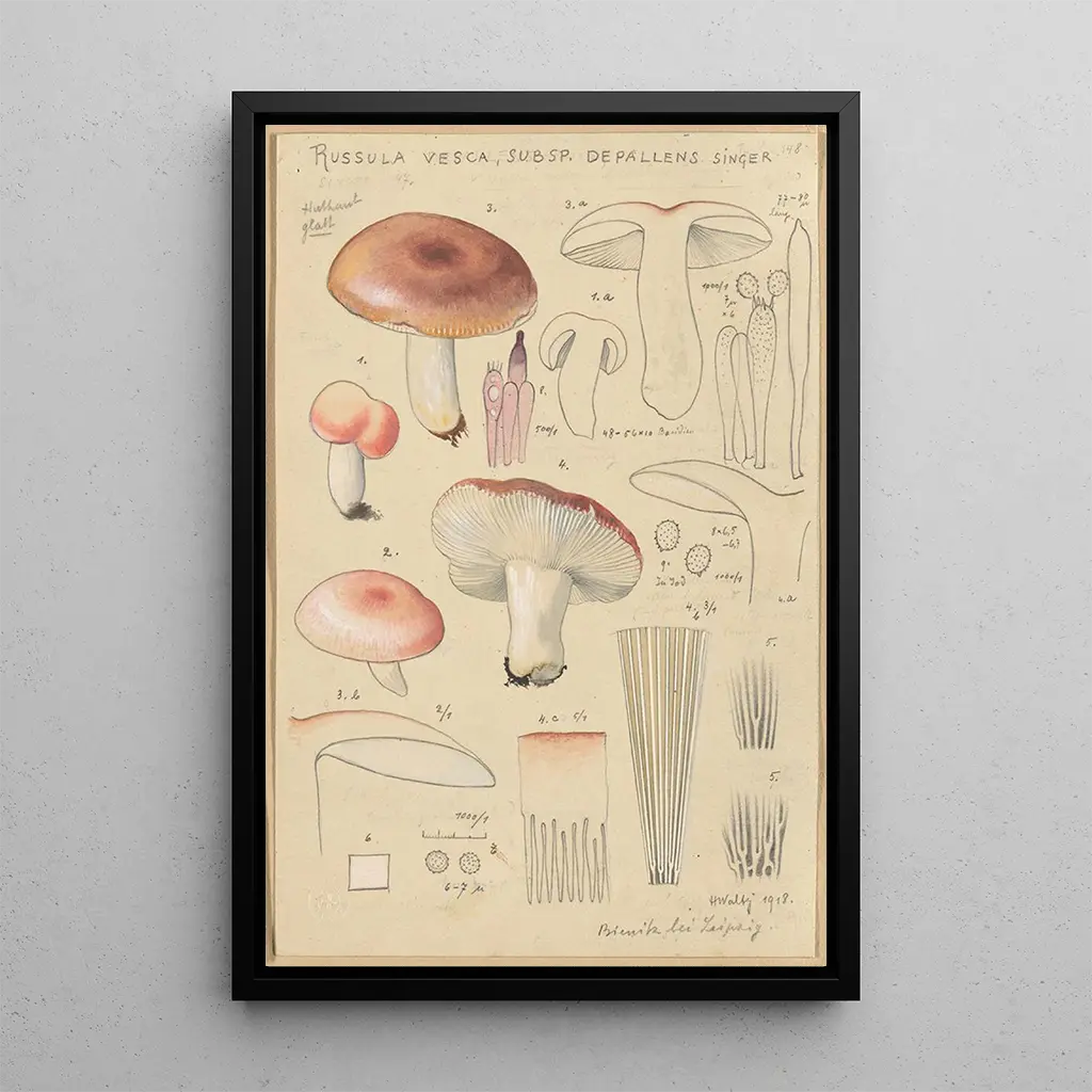 The art print of Russula vesca subsp Depallens singer is an ideal decorative choice for those wishing to add a touch of originality to their interior. Whether in a living room, office, or bedroom, this canvas draws the eye and sparks interest. Its printing quality ensures remarkable fidelity to the details and colors of the original work, guaranteeing lasting aesthetic appeal. By incorporating this piece into your decor, you create a warm and welcoming atmosphere in your space, while celebrating the beauty of nature and the richness of its ecosystem.