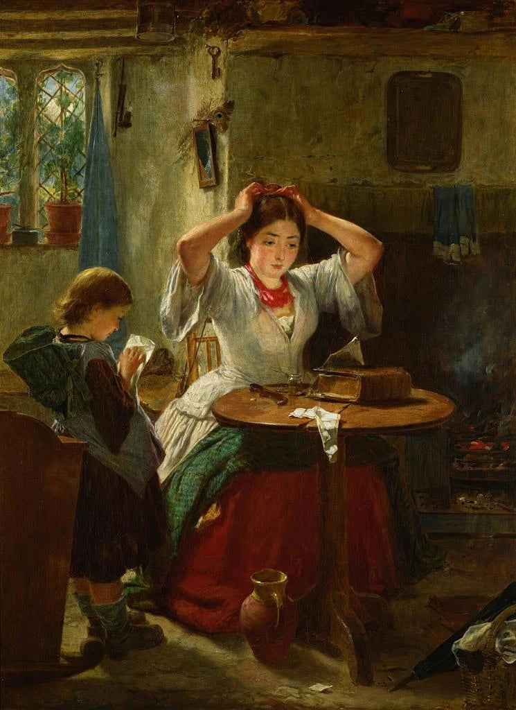 La reproduction de La toilette rustique de Thomas Faed évoque une scène intime et délicate, où la beauté réside dans la simplicité des gestes quotidiens. Cette toile dépeint une femme en train de se préparer, entourée d'un décor rural qui rappelle la tranquillité de la vie à la campagne. Les couleurs douces et les lumières naturelles créent une atmosphère chaleureuse, tandis que les détails minutieux des vêtements et des accessoires ajoutent une touche de réalisme. Faed parvient à capturer l'essence de la féminité et de la sérénité, offrant ainsi une vision poétique de la vie domestique.