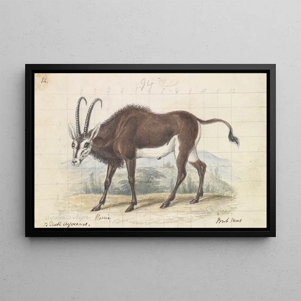 Antelope Sand: A Wild Elegance Captured The artwork "Antilope sable" by Charles Hamilton Smith is a fascinating depiction of this majestic animal, where light plays on the nuances of its golden coat. The composition, both dynamic and harmonious, highlights the grace of the antelope in its natural habitat. The warm, earthy colors evoke the savannah, while the meticulous details of the fur and horns add striking depth to this art print. The overall atmosphere is imbued with a wild serenity, inviting the viewer to escape into a world where nature reigns supreme. Charles Hamilton Smith: A Pioneer of Naturalist Art Charles Hamilton Smith, active in the early 19th century, is recognized for his contributions to naturalist art, a movement aimed at depicting wildlife and flora with striking realism. Influenced by his travels and field studies, Smith was able to capture the very essence of his subjects, going beyond simple representation to convey genuine emotion. His works, often inspired by science and observation, played a key role in educating the public about biodiversity. "Antilope sable" testifies to his commitment to nature and his talent for immortalizing animal beauty. A Decorative Acquisition with Multiple Benefits The art print "Antilope sable" is an ideal decorative piece to enhance your interior, whether in a living room, office, or bedroom. Its print quality and fidelity to the original colors make this canvas a true aesthetic asset. By adding this artwork to your decor, you bring a touch of elegance and nature to your space, while sparking conversations about art and wildlife. This painting, through its beauty and message, will appeal to art and nature enthusiasts, making each room unique and welcoming.