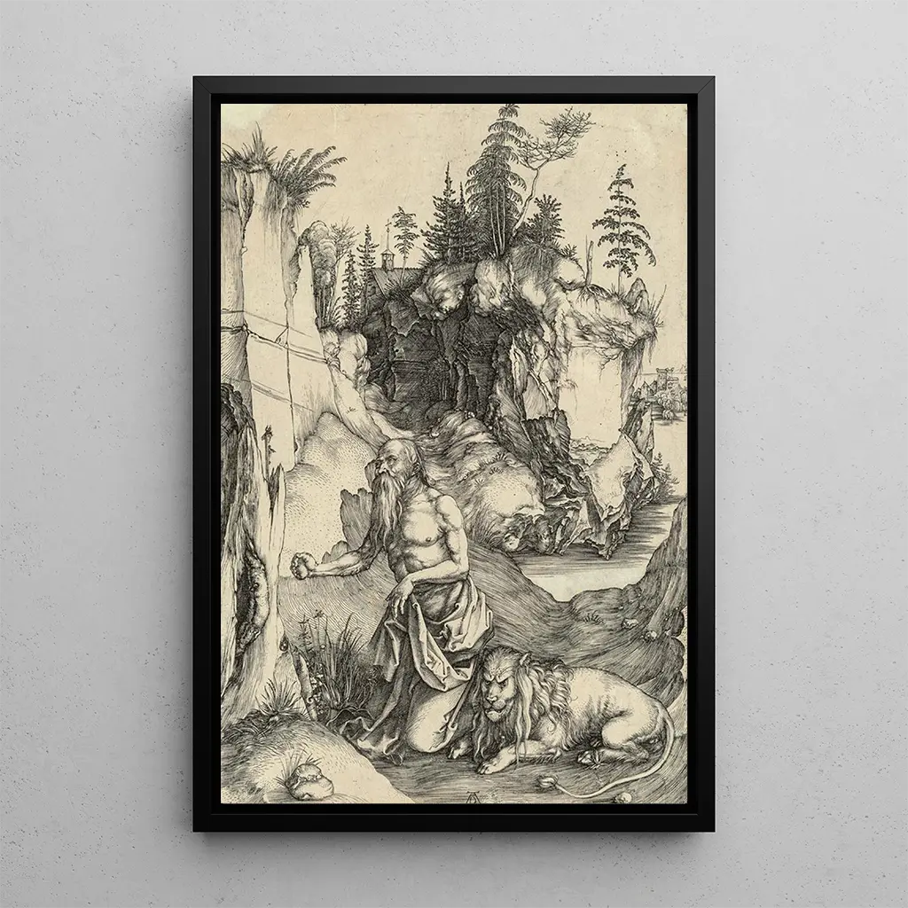 In this iconic art print, Albrecht Dürer immerses us in the spiritual universe of Saint Jerome, a man in search of redemption. The composition, rich in detail, highlights a contemplative Jerome, surrounded by symbolic elements such as the lion and books. The earthy colors and delicate shades create an atmosphere of serenity and reflection. The wood engraving technique, mastered by Dürer, captures each texture with striking precision, inviting the viewer to immerse themselves in this scene of devotion.
