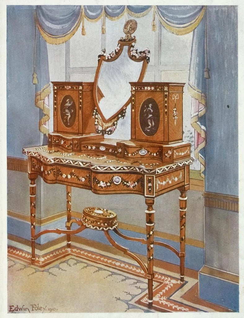 The artwork "Coiffeuse en bois de satin avec médaillons" by Edwin Foley stands as a compelling testament to the craftsmanship and aesthetic refinement of the early 20th century. This piece, which combines functionality and art, embodies the spirit of a time when every everyday object was designed with meticulous attention to detail. The vanity, beyond its simple utility, becomes a true object of contemplation, a reflection of the tastes and aspirations of a society in full transformation. Entering Foley's universe, the viewer is invited to explore a world where satinwood, noble and warm, transforms into a work of art in its own right.