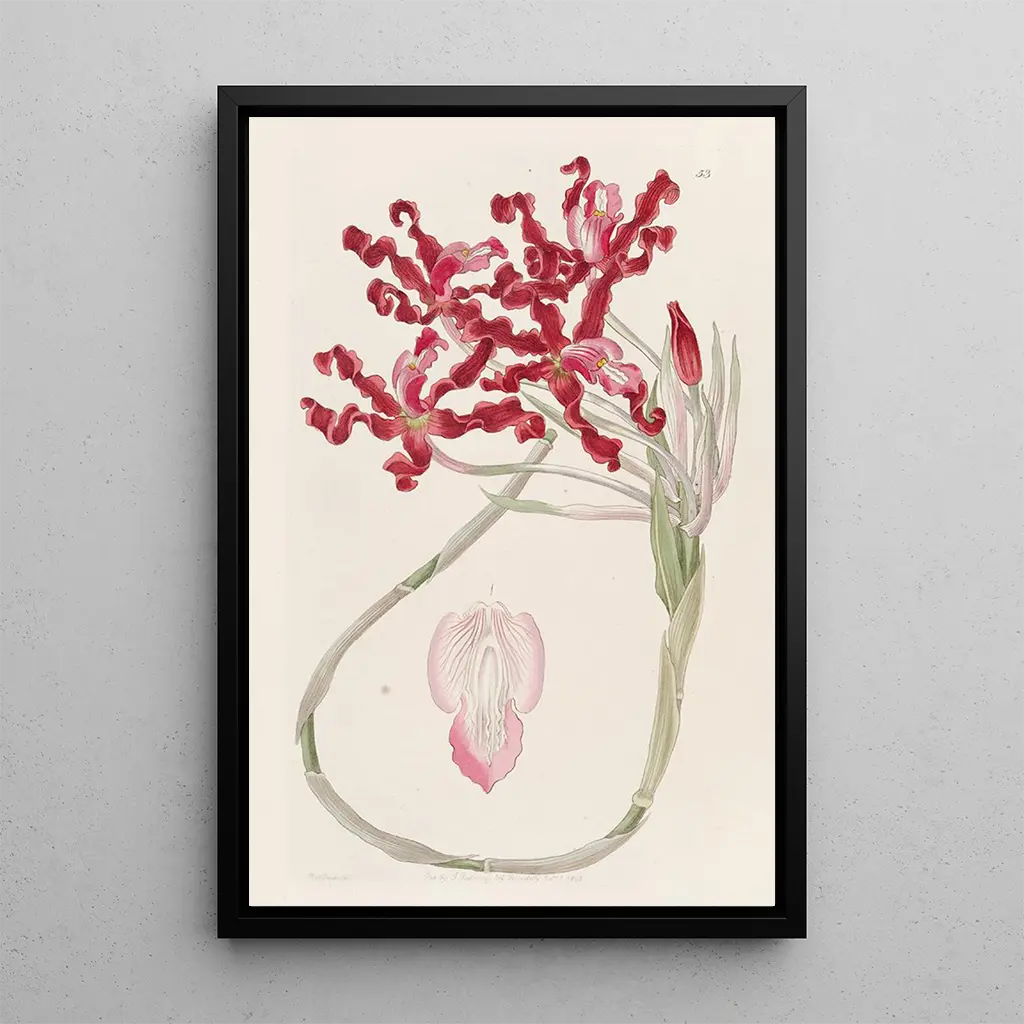 Schomburgkia ondulée: a captivating floral dance The art print of the Schomburgkia ondulée, a masterpiece by Sydenham Edwards, immerses us in a botanical universe where the delicacy of the petals blends with the vigor of the stems. The vibrant colors, ranging from deep violet to bright white, create a striking contrast that captures the eye. The engraving technique used by Edwards imparts remarkable precision to every detail, paying homage to the natural beauty of this orchid. The atmosphere conveyed by this artwork evokes a soothing serenity, inviting wonder at the splendor of nature. Sydenham Edwards: a pioneer of botanical illustration Sydenham Edwards, active in the early 19th century, is recognized for his significant role in botanical illustration. Influenced by the scientific discoveries of his time, he mastered the art of combining aesthetics and science, making his works both beautiful and informative. His work was widely disseminated through publications like "The Botanical Register," where he showcased rare and exotic species. Edwards thus contributed to the popularization of tropical plants in Europe, establishing himself as an iconic figure in botanical art. His passion for nature and attention to detail make his art prints visual treasures. A decorative piece with multiple virtues The art print of the Schomburgkia ondulée is an ideal decorative item to enhance your interior, whether in a living room, office, or bedroom. Its print quality and fidelity to the original colors make it an attractive choice for enthusiasts of botany and art. Hung on the wall, this artwork adds a touch of elegance and freshness, while sparking curiosity among your guests. By choosing this piece, you opt for a decorative element that combines aesthetics and culture, transforming your space into a true garden of wonder.