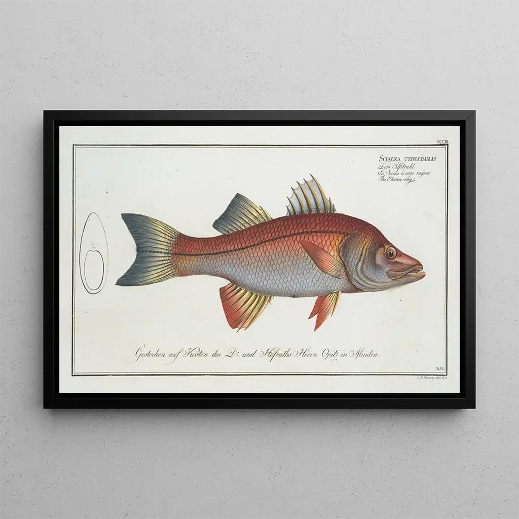 The art print of Sciaena undecimalis, the eleven-ray, makes an ideal decorative piece for various spaces, whether a living room, office, or bedroom. Its print quality and fidelity to the original details ensure undeniable aesthetic appeal. This painting, with its vivid colors and captivating subject, brings a touch of freshness and elegance to your interior. By choosing this canvas, you opt for a work that not only enhances your space but also evokes the richness of marine life, inspiring curiosity and admiration.