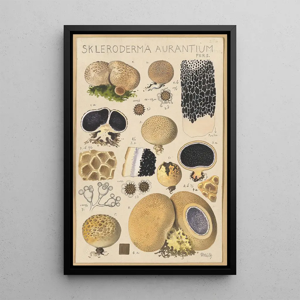 The art print of Scleroderma aurantium Pers, a captivating work by Hans Baldung, immerses us in a universe where nature and art meet with rare intensity. This canvas, rich in detail, features vibrant colors that evoke both the beauty and mystery of fungi. Baldung's technique, blending precision and expressiveness, creates an almost magical atmosphere, inviting the viewer to explore the subtleties of plant life. Each brushstroke seems to tell a story, revealing the nuances of light and shadow dancing across the surface of the artwork.