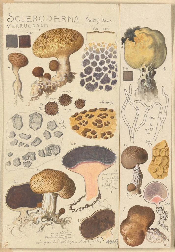 Scleroderma verrucosum, an iconic art print by Hans Baldung, invites us to explore the richness and diversity of the fungal world. This artistic representation features a mushroom with unique shapes, whose rough texture and varied hues immediately capture attention. The colors, ranging from subtle grays to warm browns, create an atmosphere that is both mysterious and familiar. Baldung's technique, combining precision and expressiveness, brings this natural subject to life, transforming a simple study into a true art print. The piece encourages attentive contemplation, revealing the hidden beauty of nature.