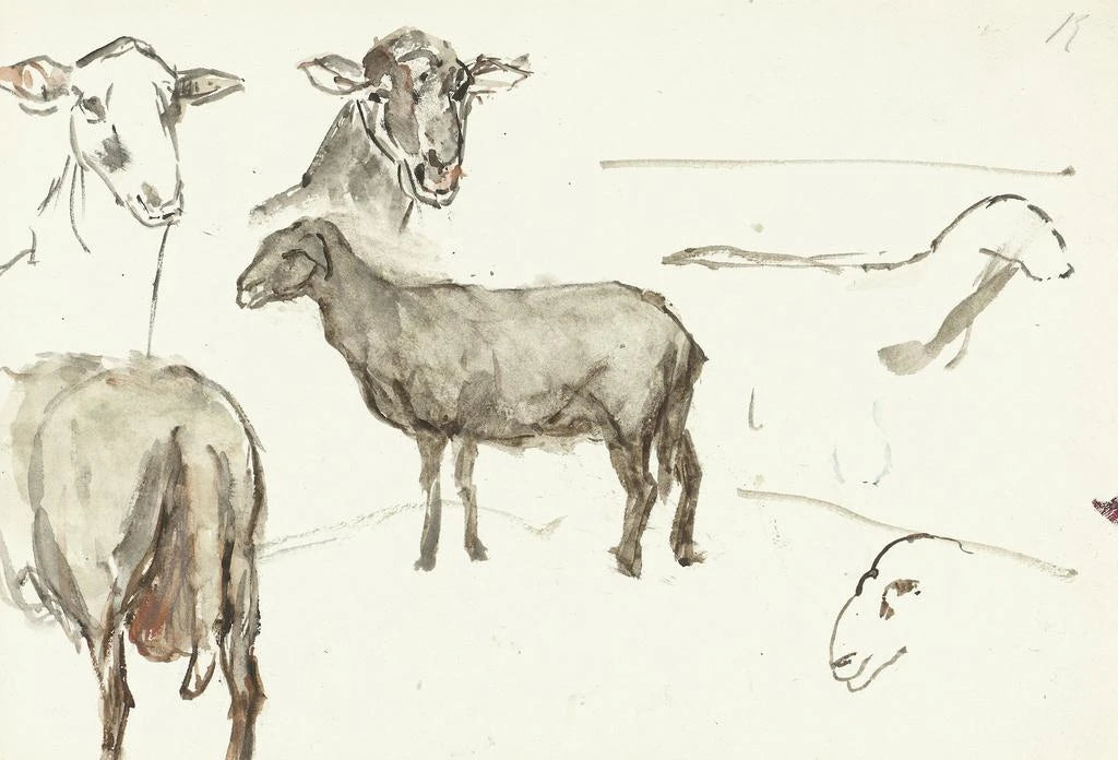 In this art print of Sheep Sketches, Sientje Mesdag van Houten captures the serenity of rural landscapes. The delicate strokes and soft nuances of the palette evoke a peaceful atmosphere, where the sheep seem to blend harmoniously into their environment. The artist's technique, combining watercolor and drawing, brings each animal to life, making the texture of their wool palpable. Light shadows and subtle highlights create a balanced composition, inviting the viewer to immerse themselves in this bucolic scene. Each sketch is an open window to a tranquil world, where nature and animals meet with tenderness.