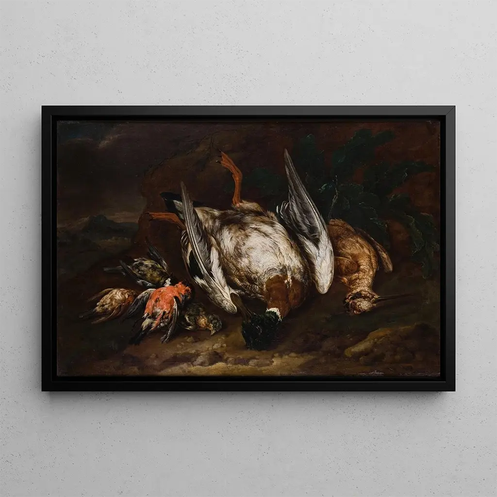 The art print Birds Shot Down by Bernaert de Birdt immerses us in an atmosphere that is both tragic and captivating. This piece, created with oil painting techniques, highlights a carefully composed scene where the birds, frozen in their fall, seem to capture a moment of suspended life. The colors, rich and nuanced, evoke the fleeting beauty of nature, while the meticulous details of the feathers and shadows create a striking depth. The artist succeeds in conveying a powerful emotion, inviting the viewer to reflect on the fragility of life and the beauty of flying creatures.
