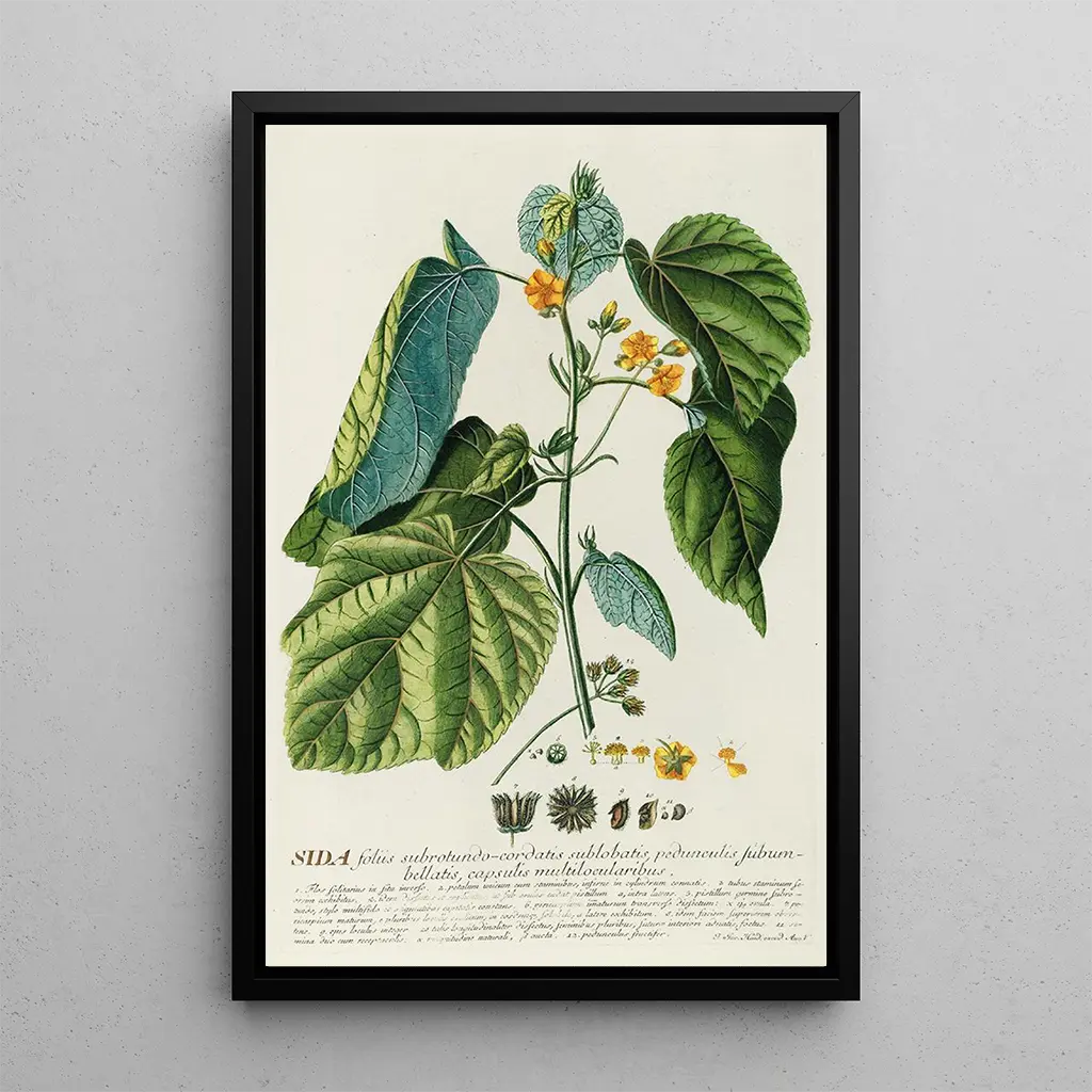 The Sida art print, by Georg Dionysius Ehret, transports us into a world of fascinating colors and textures. This print highlights the Sida plant, known for its delicate flowers and vibrant leaves. The shades of yellow and green intertwine harmoniously, creating an atmosphere that is both soothing and dynamic. Ehret's technique, which combines precision and sensitivity, allows you to feel the lightness of the petals and the sturdiness of the stems. This piece is a true ode to nature, inviting observation and wonder. Georg Dionysius Ehret: a master of botanical art Georg Dionysius Ehret, a botanical illustrator of the 18th century, made his mark with his innovative approach to plant representation. Influenced by the scientific advances of his time, he skillfully blended scientific rigor with aesthetic appeal. His works, often created to accompany botanical books, helped introduce many species to a broad audience. Ehret traveled across Europe, collaborating with botanists and naturalists, which enriched his palette and style. His legacy endures, demonstrating the importance of art in understanding the natural world. A decorative acquisition with multiple benefits The art print of the Sida painting is a valuable addition to any interior decor, whether in a living room, office, or bedroom. Its printing quality ensures fidelity to the details and colors of the original artwork, bringing a touch of freshness and vitality to your space. This print is not only aesthetically pleasing but also evokes the beauty of nature, creating a serene and inspiring atmosphere. By incorporating this print into your decor, you choose a piece that enriches your environment while celebrating botanical art.