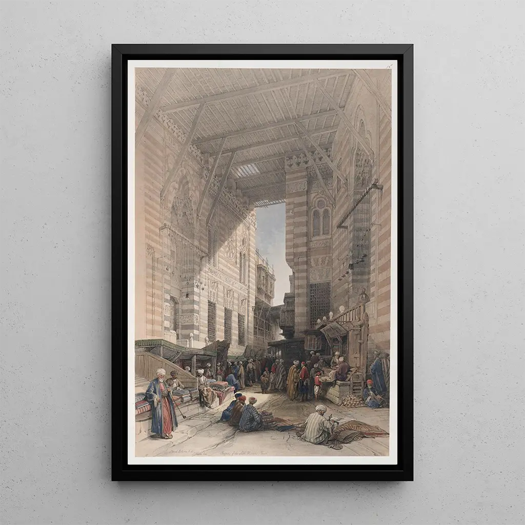 Dans cette art print du tableau "Bazar des marchands de soie Le Caire", David Roberts nous plonge dans l'effervescence d'un marché animé. Les teintes vives des étoffes s'entremêlent avec les nuances chaudes du soleil caressant les ruelles étroites. La technique de l'aquarelle, utilisée avec maestria, confère à l'œuvre une légèreté et une fluidité qui rendent presque palpable l'atmosphère vibrante de ce lieu emblématique. Chaque détail, des visages des marchands aux textures des tissus, évoque une invitation à la découverte et à l'émerveillement, transportant le spectateur dans un monde où le temps semble suspendu.