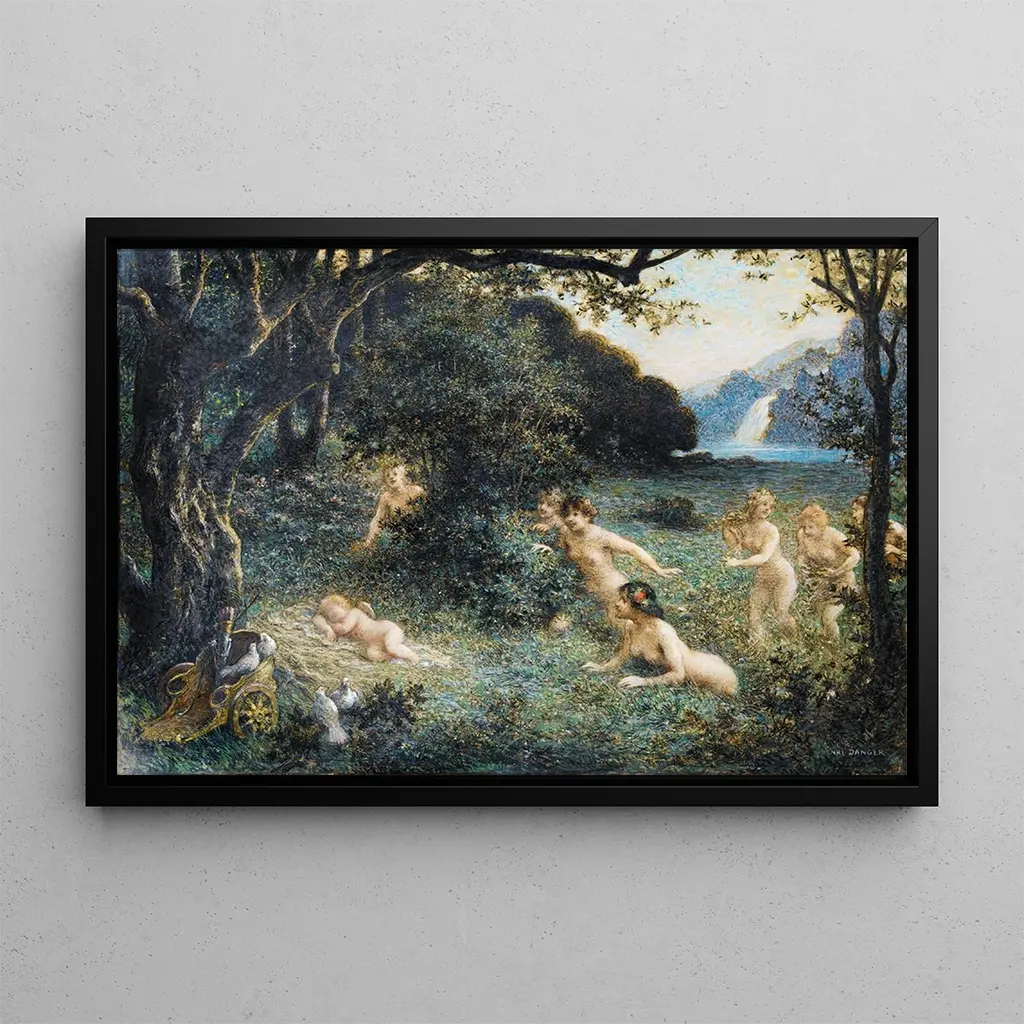 Cupidon endormi: an art print of serenity and peace Cupidon endormi, an iconic art print by Henri Camille Danger, evokes delicate serenity through the depiction of a young god of love in peaceful sleep. The composition, where light caresses the delicate forms of Cupid's body, creates an atmosphere of dreamlike tranquility. Soft colors, ranging from pale pinks to subtle blues, reinforce this sense of calm. The artist's technique, blending realism and romanticism, captures the ephemeral beauty of childhood and love, offering an invitation to contemplation. Henri Camille Danger: a master of French romanticism Henri Camille Danger, active in the 19th century, is recognized for his works imbued with romanticism and sensuality. Influenced by the great masters of classical painting, he developed a personal style that combines finesse and emotion. His paintings, often populated with mythological or allegorical figures, testify to an era where art sought to capture the deepest human feelings. Danger established himself among the artists of his time, leaving a legacy that continues to inspire art lovers and collectors. A decorative art print with multiple virtues The reproduction of Cupidon endormi is an ideal decorative piece to add a touch of softness and romanticism to your interior. Whether in a living room, office, or bedroom, this art print will appeal through its quality and fidelity to the original work. Its aesthetic appeal, combined with careful reproduction techniques, makes it a perfect choice for those wishing to enrich their decor while celebrating classical art. Treat yourself to this canvas and let yourself be carried away by the magic of love and beauty.