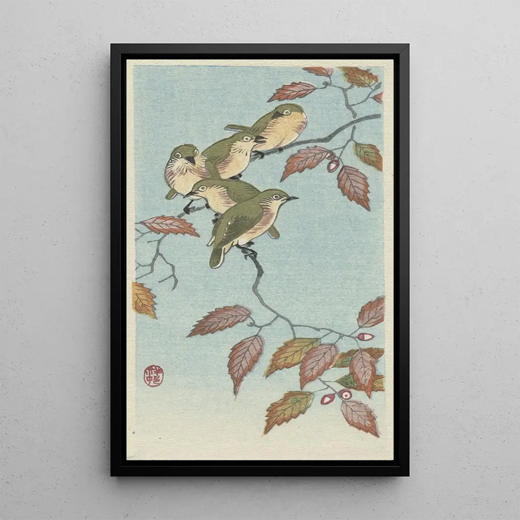 Dans cette art print de "Petits oiseaux sur une brindille", Ohara Koson nous transporte au cœur d'une scène paisible où la nature s'épanouit. Les oiseaux, délicatement posés sur une brindille, sont rendus avec une précision remarquable, leurs plumages aux nuances douces et naturelles. La technique de l'estampe sur papier, typique de l'ukiyo-e, confère à l'œuvre une atmosphère sereine et contemplative. Les couleurs pastel, mêlant des teintes de bleu, de vert et de beige, évoquent une douceur printanière, invitant le spectateur à s'arrêter et à apprécier la beauté éphémère de la vie sauvage.
