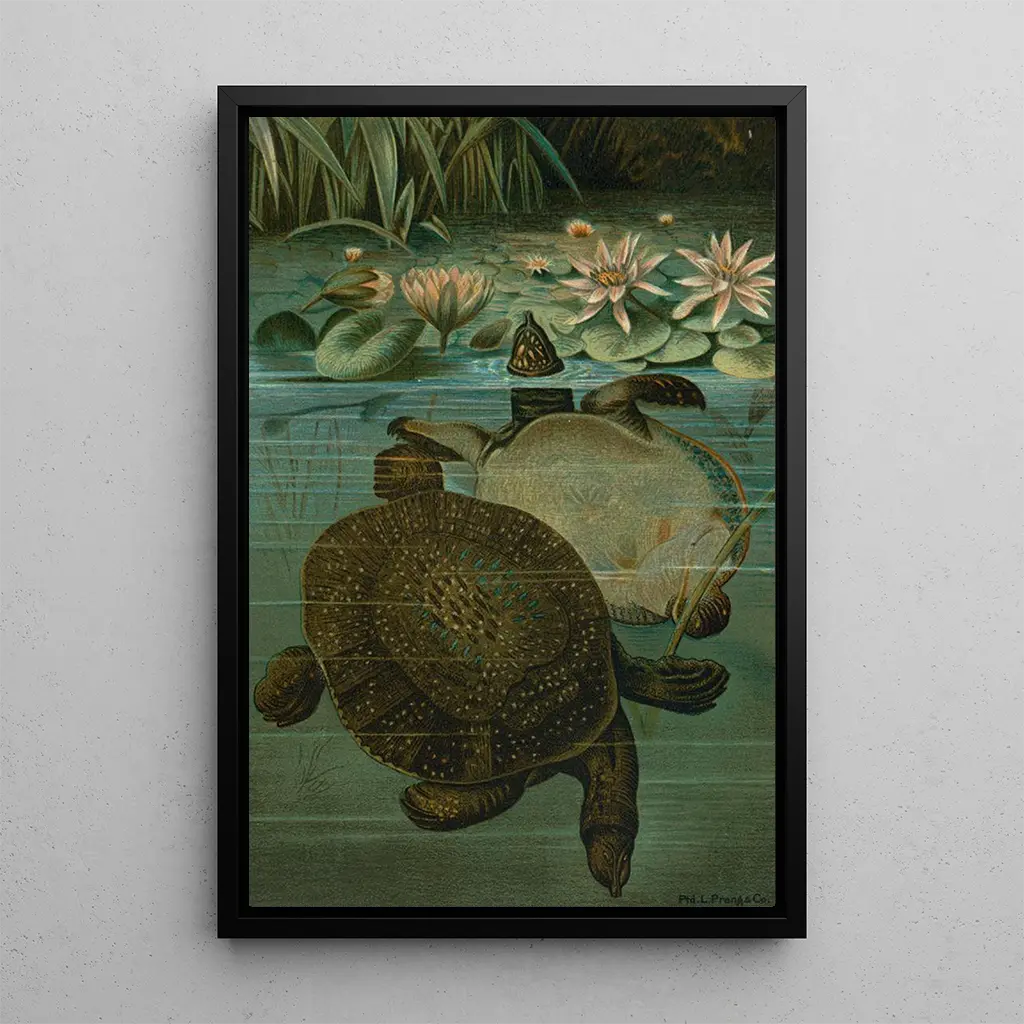 In "Soft Turtles," John George Wood invites us to explore the subtle beauty of these aquatic reptiles. The artwork, rich in detail, highlights the unique texture of the turtles' shells as well as their natural environment. The earthy tones and shades of green create a calming atmosphere, evoking the tranquility of rivers and lakes. Wood's technique, which combines watercolor and drawing, brings these creatures to life, giving them an almost tangible presence. This painting is a celebration of aquatic life, a tribute to the diversity of species that inhabit our ecosystems.
