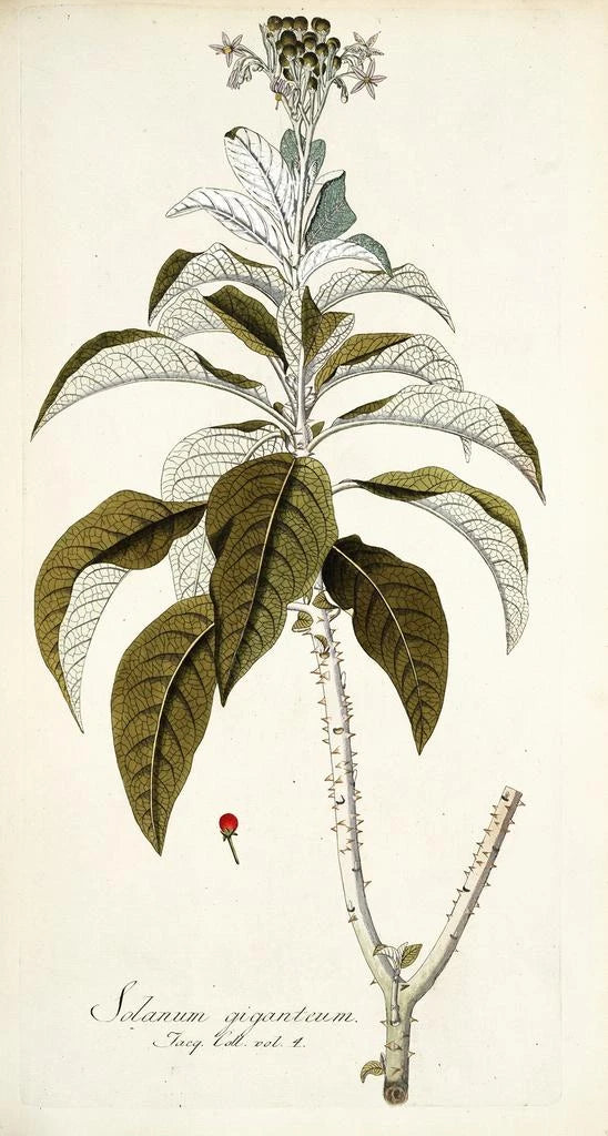 Nikolaus Joseph Freiherr von Jacquin, botanist and artist of the 18th century, played a key role in the study of exotic plants. Born in 1727 in Austria, he traveled around the world, notably in South America, where he discovered many plant species. His work is part of the naturalism movement, which aimed to represent nature in a faithful and scientific manner. Jacquin was influenced by the discoveries of his time and contributed to the classification of plants, while integrating an artistic dimension into his studies. "Solanum giganteum" is a perfect example of his approach, combining science and beauty.