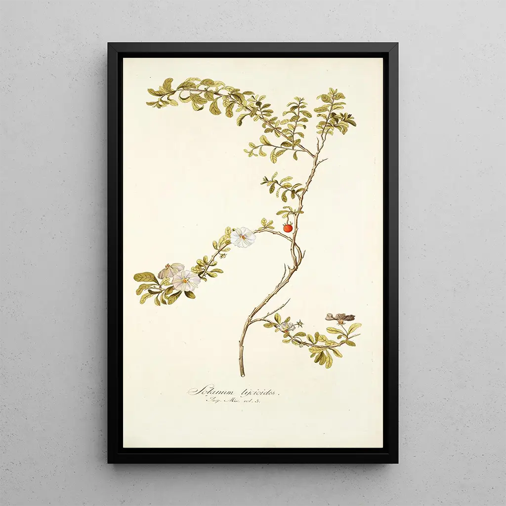 The art print of Solanum lycioides, by Nikolaus Joseph Freiherr von Jacquin, immerses us in a universe where nature is highlighted with remarkable precision. The intricate details of the leaves and flowers, combined with a vibrant color palette, create a lively and dynamic atmosphere. The watercolor technique, masterfully employed, captures the delicacy of the forms while offering visual depth that draws the eye. Every element of this art print seems to tell a story, inviting the viewer to explore the subtleties of botany.