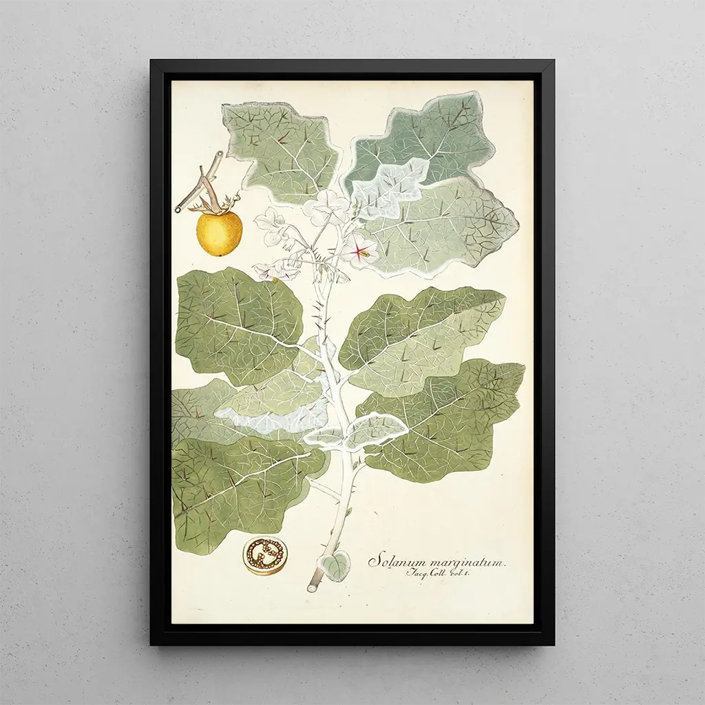Solanum marginatum: a botanical beauty revealed The art print of Solanum marginatum, a work by Nikolaus Joseph Freiherr von Jacquin, invites us to discover the splendor of plants through an artistic perspective. The shades of green and purple, carefully applied, evoke the richness of nature. The harmonious composition highlights the delicate shapes of the leaves and flowers, creating a soothing and inspiring atmosphere. Thanks to watercolor techniques, every detail is accentuated, offering a captivating visual experience that transports the viewer into a lush garden. Nikolaus Joseph Freiherr von Jacquin: a master of botanical illustration Nikolaus Joseph Freiherr von Jacquin, an 18th-century botanist and illustrator, is recognized for his significant contributions to botanical science. His travels in South America allowed him to discover and document a multitude of plants, including Solanum marginatum. His work combines scientific rigor with artistic sensibility, making him a pioneer in the field of botanical illustration. Jacquin was able to capture the essence of plant species with unparalleled precision, influencing many artists and scientists of his time. A decorative piece with multiple virtues The art print of Solanum marginatum is a decorative item that will enhance any space. Whether in a living room, office, or bedroom, this artwork adds a touch of nature and serenity. Its printing quality ensures remarkable fidelity to the colors and details of the original work, allowing full appreciation of the beauty of this plant. By integrating this canvas into your decor, you add not only a piece of art but also a conversation starter that will delight your guests.