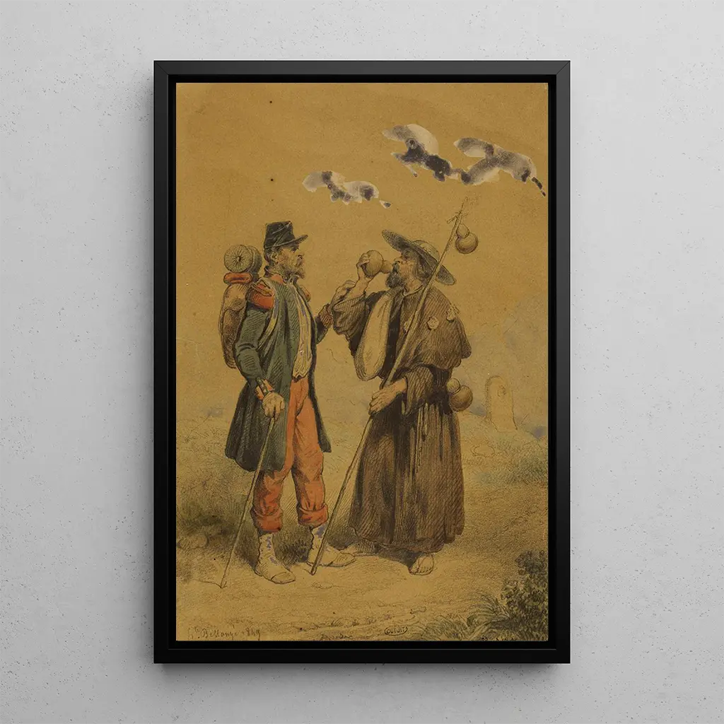 In the artwork "Soldat donnant à boire à un pèlerin" by Hippolyte Bellangé, a moment of tenderness and humanity unfolds before our eyes. The scene, rich in detail, features a soldier in uniform offering water to a tired pilgrim. The warm, earthy colors evoke an atmosphere of warmth and solidarity, while Bellangé's technique, blending realism and romanticism, brings this emotional interaction to life. Every element of the composition, from expressions to postures, contributes to creating a powerful visual narrative that touches the heart.