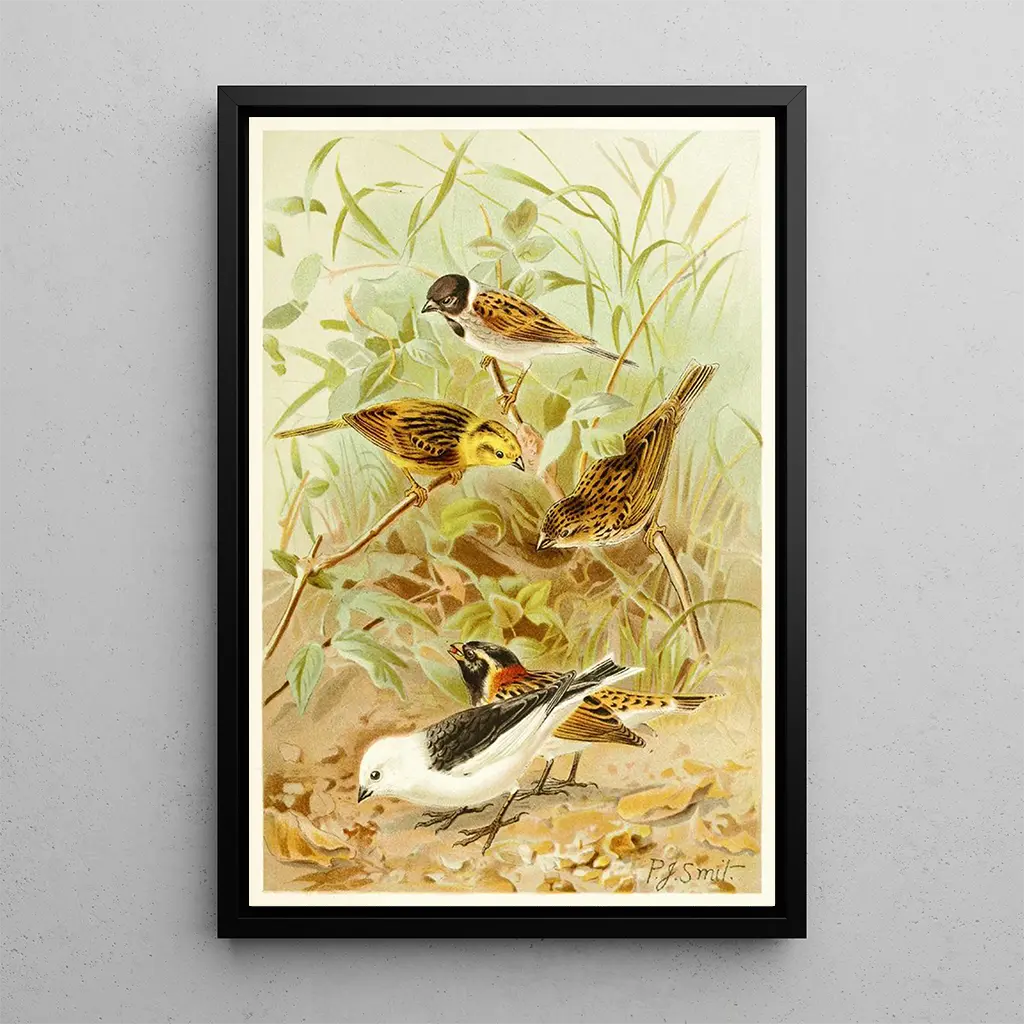 The art print of "Bruants" by Pierre Jacques Smit evokes the lightness and melody of these songbirds. In this work, the nuances of pastel colors blend harmoniously, creating a soft and soothing atmosphere. Smit's technique, which combines precision and delicacy, captures the very essence of the bruants, their delicate feathers, and their graceful poses. Every detail, from the leaves to the birds, is carefully rendered, inviting the viewer to immerse themselves in this serene and joyful tableau.