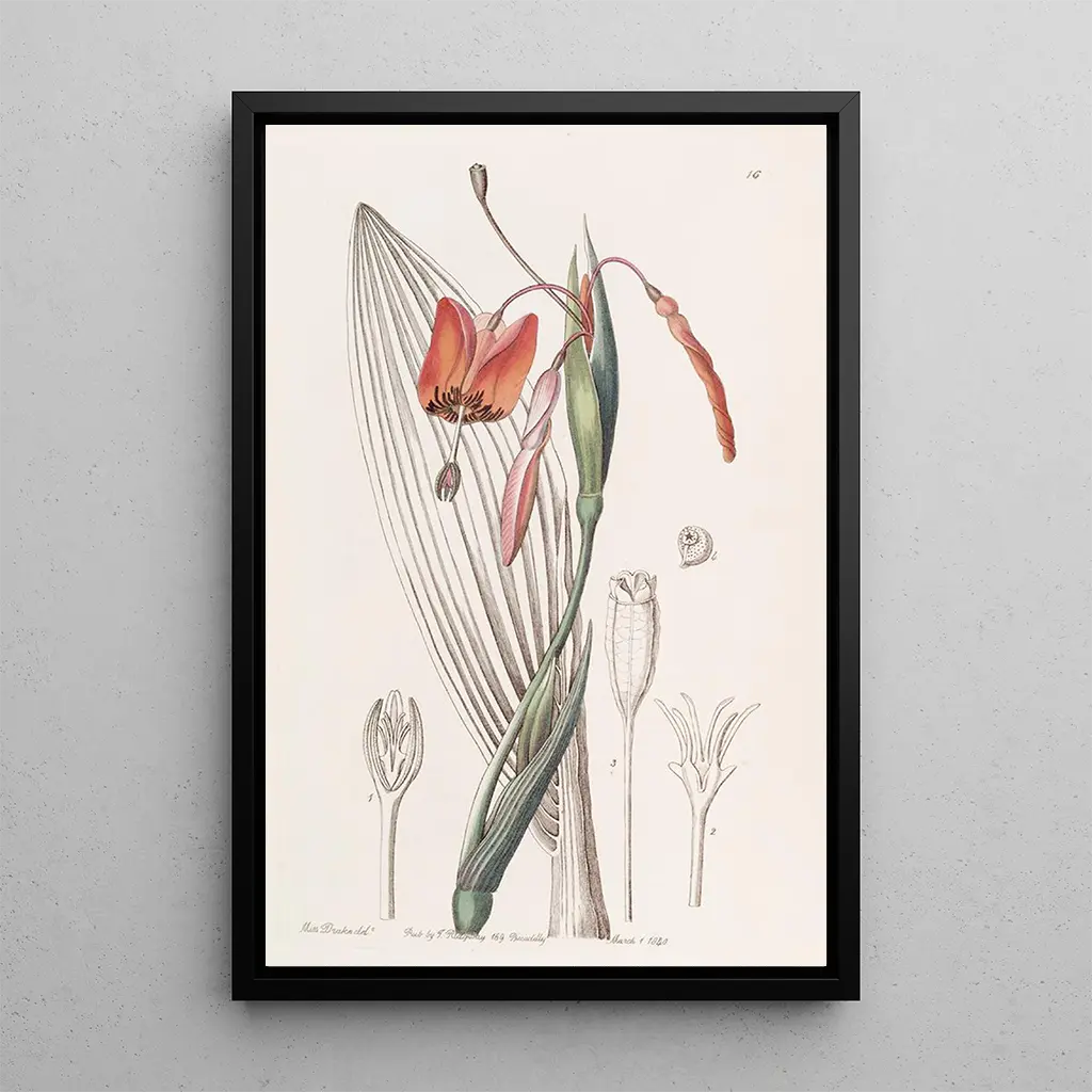 Sydenham Edwards's "Flame-colored stiff stem" is a piece that captures attention through its chromatic intensity. This art print, with its fiery shades of red and orange, evokes passion and energy from nature. The meticulous details of the stem and leaves, rendered with refined watercolor techniques, create an impression of movement and vitality. The atmosphere conveyed by this work is both dynamic and warm, inviting active contemplation. Each element seems to dance under the light, offering a captivating visual experience.