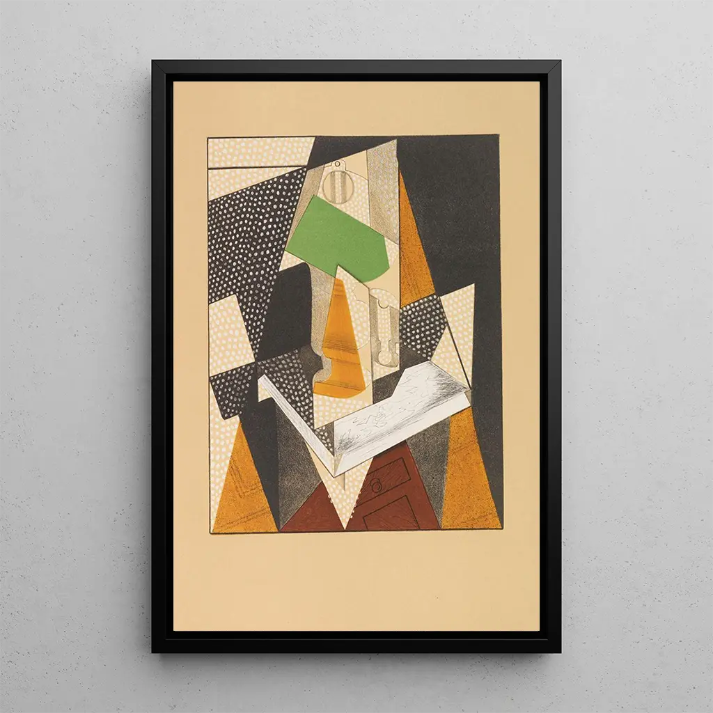 At the heart of this captivating art print, "At the ceiling's sunlight," Juan Gris immerses us in a universe where geometric forms intertwine with a vibrant color palette. The canvas, filled with light, evokes a scene of everyday life where objects come to life under a dazzling illumination. Shades of yellow, blue, and red blend harmoniously, creating a warm and welcoming atmosphere. The cubism technique, dear to the artist, manifests here through a decomposition of forms that invites the viewer to active contemplation, seeking beauty in the simplicity of everyday objects.