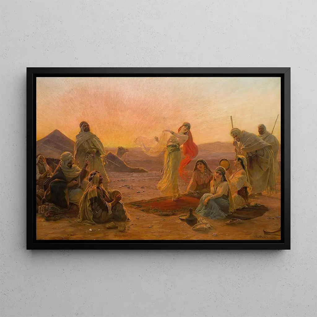 "Danse au Coucher du Soleil" is a vibrant art print that captures the essence of a fleeting moment, where the golden light of the setting sun envelops the dancers in a warm and festive atmosphere. The vivid colors, ranging from deep oranges to delicate violets, create a striking contrast that immediately draws the eye. The oil on canvas technique allows Otto Pilny to play with shadows and lights, bringing to life the graceful movements of the dancing figures. This scene evokes a joy of living and a celebration of the beauty of the present moment.