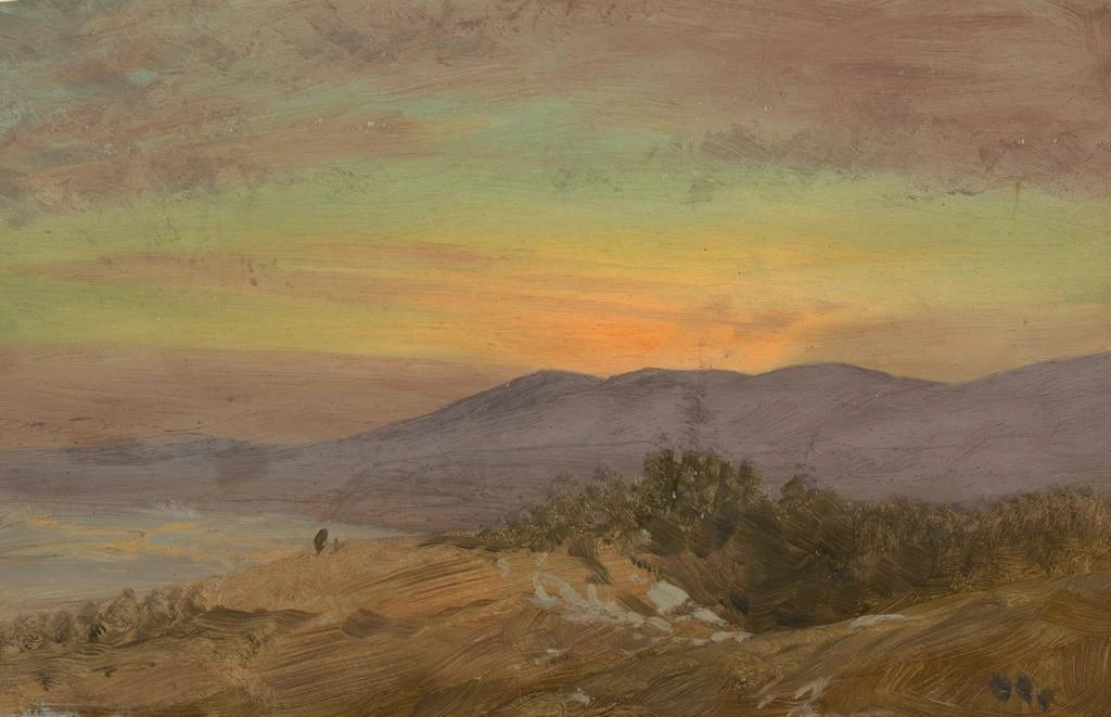 Frederic Edwin Church, one of the leading figures of the Hudson River School movement, played a crucial role in the evolution of American landscape art in the 19th century. Born in 1826 in Hartford, Connecticut, he was influenced by his travels in South America and by the works of his contemporaries, such as Thomas Cole. Church mastered the blend of realism and romanticism, creating grand landscapes that celebrate the wild beauty of nature. "Sunset in the Hudson Valley" is emblematic of his style, illustrating his talent for evoking emotions through majestic landscapes, while emphasizing the importance of preserving nature.