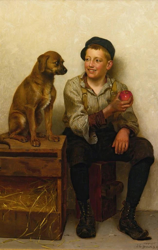 John George Brown, an emblematic figure of 19th-century American realism, specialized in depicting childhood and scenes of everyday life. His style, influenced by European masters, is characterized by a particular attention to detail and a capacity to convey deep emotions. At a time when childhood was often idealized, Brown was able to capture moments of truth, as seen in "Taquiner le chiot." His works are a valuable testimony of Victorian society, while celebrating the beauty of human interactions.
