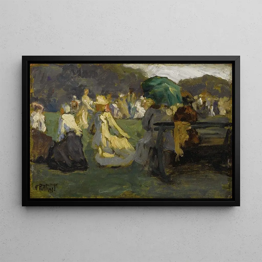Tennis on Grass at St Ives: An Outdoor Scene The art print of Tennis on Grass at St Ives transports us to a summery atmosphere where sport and conviviality meet. The bright and luminous colors, typical of Edward Henry Potthast's work, evoke the warmth of the sun and the energy of the players on the court. The dynamic composition, with characters in motion and detailed craftsmanship, creates a joyful and lively ambiance. This art print captures not only the action of the game but also the spirit of camaraderie that prevails during these outdoor sporting encounters, inviting the viewer to share this moment of pleasure. Edward Henry Potthast: a master of American plein air art Edward Henry Potthast, active at the end of the 19th century and the beginning of the 20th century, is an American artist renowned for his scenes of daily life and outdoor landscapes. Influenced by Impressionism, he was able to capture light and colors vibrantly, which allowed him to stand out in the art world. His works, including this art print, reflect a time when plein air painting became a place of gathering and escape. Potthast managed to immortalize simple yet precious moments, making his paintings testimonies of the social life of his era. A decorative acquisition with multiple assets This art print of Tennis on Grass at St Ives is a perfect choice to brighten your interior with a touch of dynamism and joy. Whether in a living room, game room, or office, this canvas brings a lively and engaging atmosphere. The quality of printing ensures faithful reproduction of vibrant colors and details of the original artwork, offering undeniable aesthetic appeal. By adding this art print to your decor, you create a welcoming and inspiring space, conducive to conviviality and exchanges.