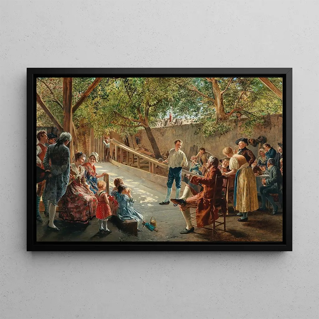 Johann Hamza's Bowling Alley immerses us in a lively and animated scene, where the excitement of a shared leisure moment is felt. The warm and luminous colors, combined with a delicate painting technique, bring to life the characters busy around the pins. The joyful expressions and dynamic gestures of the players create an atmosphere of celebration and camaraderie. Every detail, from clothing to accessories, reflects meticulous attention, making this art print captivating and immersive.
