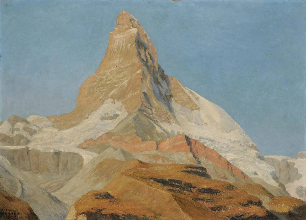 "Mount Matterhorn" by Regnault Sarasin is a piece that captures the grandeur of Swiss mountains with striking intensity. The canvas depicts the famous summit, bathed in golden light, creating a dramatic contrast between the shadows of the rocks and the clarity of the sky. The vivid colors and meticulous details reveal Sarasin's mastery in representing Alpine landscapes. The atmosphere of this work is both majestic and serene, inviting the viewer to feel the power of nature. Each brushstroke evokes the wild beauty and vastness of the mountains, transporting the observer on an unforgettable visual journey.
