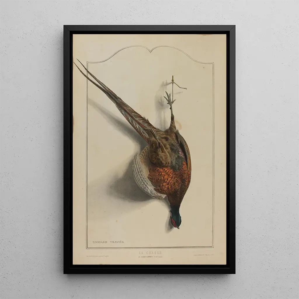 "The hunt for the common pheasant" is an art print that immerses the viewer in the vibrant world of wildlife. Édouard Travis, with his undeniable talent, manages to capture the movement and energy of the scene, where pheasants take flight in a burst of colors. The meticulous details of the feathers and the realism of the natural elements demonstrate remarkable technical mastery. The atmosphere of this painting evokes both the beauty of nature and the excitement of hunting, creating a balance between action and contemplation. Édouard Travis: a master of animal realism Édouard Travis is renowned for his realistic approach to animal painting, a genre that gained popularity in the 19th century. Influenced by the great masters of naturalist painting, he stands out for his ability to depict animals in their natural habitat with striking accuracy. Travis has captured the essence of wildlife, making his works testimonies to the beauty and fragility of nature. His work played a crucial role in the evolution of animal painting, marking an era where art and nature converge. A decorative acquisition with multiple assets The reproduction of "The hunt for the common pheasant" is a decorative piece that will add an authentic touch to your interior. Whether in an office, a living room, or a dining room, this art print evokes the beauty of nature and sparks conversations. Its print quality and fidelity to the original work make it an ideal choice for art enthusiasts. By integrating this canvas into your decor, you add an artistic dimension that enriches your space while celebrating the majesty of wildlife.