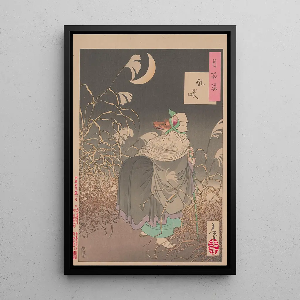 Dans cette art print du tableau "Le cri du renard Konkai", Tsukioka Yoshitoshi nous plonge dans un univers où la nature et le fantastique se rencontrent. Les couleurs vives et les traits délicats de l'artiste créent une atmosphère à la fois troublante et envoûtante. Le renard, symbole de transformation et de mystère dans la culture japonaise, semble émettre un cri qui résonne à travers le paysage nocturne. La technique de l'estampe ukiyo-e, caractéristique de Yoshitoshi, permet de capturer des détails saisissants, des ombres subtiles et des nuances de lumière qui donnent vie à cette scène énigmatique.