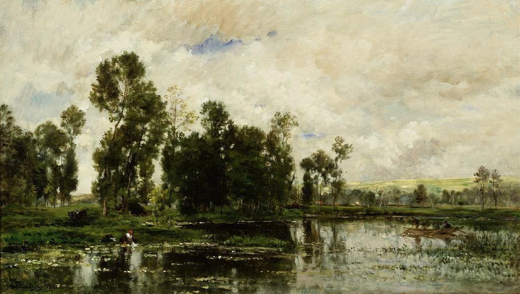 Le Bord de l'étang: A bucolic serenity at your fingertips The painting "Le Bord de l'étang" by Charles François Daubigny evokes a peaceful and contemplative atmosphere. The composition centers around a tranquil pond, surrounded by lush greenery and majestic trees. The soft, natural colors, ranging from soothing greens to the golden reflections of the setting sun, create a visual harmony that invites daydreaming. The oil painting technique, mastered by Daubigny, captures the light and nuances of nature with remarkable finesse. This artwork, a true ode to the beauty of rural landscapes, transports the viewer into a world of serenity. Charles François Daubigny: a pioneer of Impressionist landscape painting Charles François Daubigny, active in the 19th century, is recognized as one of the forerunners of the Impressionist movement. Influenced by masters of landscape painting, he developed a unique style focused on light and nature. His career began in a context where landscape painting was flourishing, and he distinguished himself by his ability to capture scenes of everyday life outdoors. Daubigny also influenced other artists, notably Vincent van Gogh, who admired his approach to color and light. His work "Le Bord de l'étang" demonstrates his talent and commitment to representing nature. A decorative acquisition with multiple advantages The art print of "Le Bord de l'étang" is an ideal decorative piece to enhance your interior. Whether in a living room, office, or bedroom, this canvas adds a touch of serenity and elegance. The quality of the print guarantees remarkable fidelity to the colors and details of the original work, allowing you to enjoy the full beauty of this bucolic scene. The aesthetic appeal of this art print makes it a perfect choice for those wishing to create a calming and inspiring atmosphere in their living space.