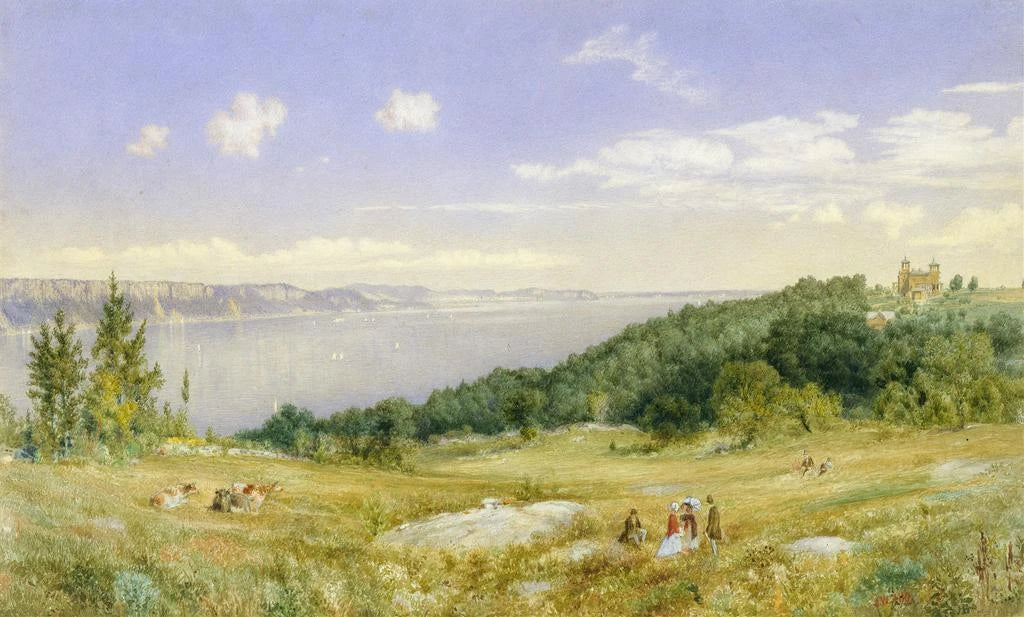 The art print of the Palisades immerses us in a bucolic landscape where nature flourishes gracefully. John William Hill, through this work, captures the beauty of majestic trees and the play of light filtering through the foliage. The shades of green, intertwined with touches of golden light, create a serene and calming atmosphere. The watercolor technique, used with finesse, allows for the transparency of the water and the delicacy of the leaves to be rendered, offering a total immersion in this living painting. Every detail is carefully observed, demonstrating a deep connection with nature.