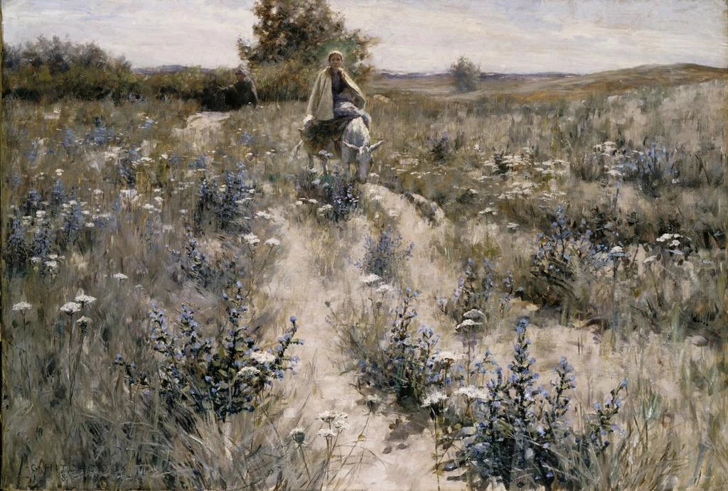 "The Flight into Egypt" by George Hitchcock is a work that evokes a moment of great spiritual and emotional intensity. The composition, rich in warm and earthy colors, depicts the Holy Family fleeing, seeking refuge and safety. The delicate details of the faces and clothing, as well as the subtle use of light, create an atmosphere filled with tenderness and melancholy. This canvas invites the viewer to reflect on the themes of protection and hope, while offering a poetic vision of the Holy Family's life.