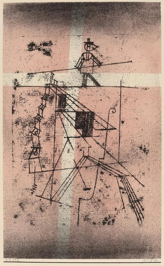 Paul Klee, Swiss artist born in 1879, is an emblematic figure of the expressionist movement and modern art. Influenced by cubism, surrealism, and music, Klee develops a unique style characterized by geometric shapes and vivid colors. His career, spanning several decades, is marked by periods of intense creativity, notably during his teaching at the Bauhaus. "The Tightrope Walker" is an art print that reflects his interest in innocence and imagination, while fitting into a rapidly evolving artistic context where conventions are challenged.