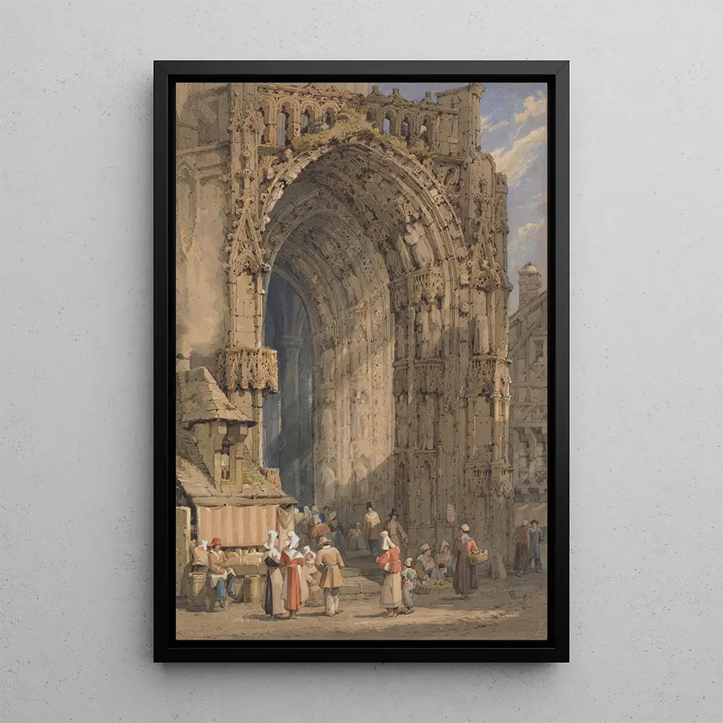 The Reims Cathedral Portal, an iconic art print by Samuel Prout, stands as a testament to Gothic architecture. The carved details, with their delicate figures and floral motifs, evoke an atmosphere of grandeur and spirituality. The shades of gray and beige, accentuated by natural light, create a fascinating play of shadows that draws the eye. Prout's technique, blending watercolor and drawing, captures the texture of the stones and the depth of the vaults, offering an invitation to contemplation and reflection on the sacred.