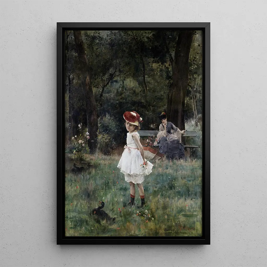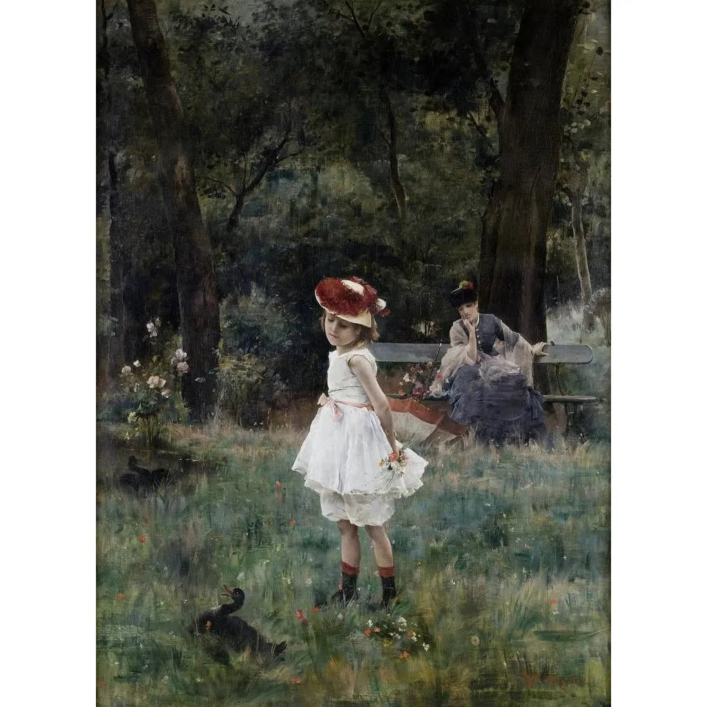 Alfred Stevens, peintre belge du XIXe siècle, est reconnu pour ses représentations de la vie quotidienne et des scènes intimistes. Influencé par le mouvement réaliste, il a su capturer l'essence de la société bourgeoise de son époque. Ses œuvres, souvent centrées sur des figures féminines, reflètent une sensibilité particulière et une observation fine des mœurs. Stevens a été actif à Paris, où il a côtoyé des artistes majeurs de son temps, et son style a évolué vers une approche plus impressionniste, intégrant des éléments de lumière et de couleur qui enrichissent ses compositions. La fillette aux canards illustre parfaitement son talent pour évoquer des émotions à travers des scènes simples mais poignantes.