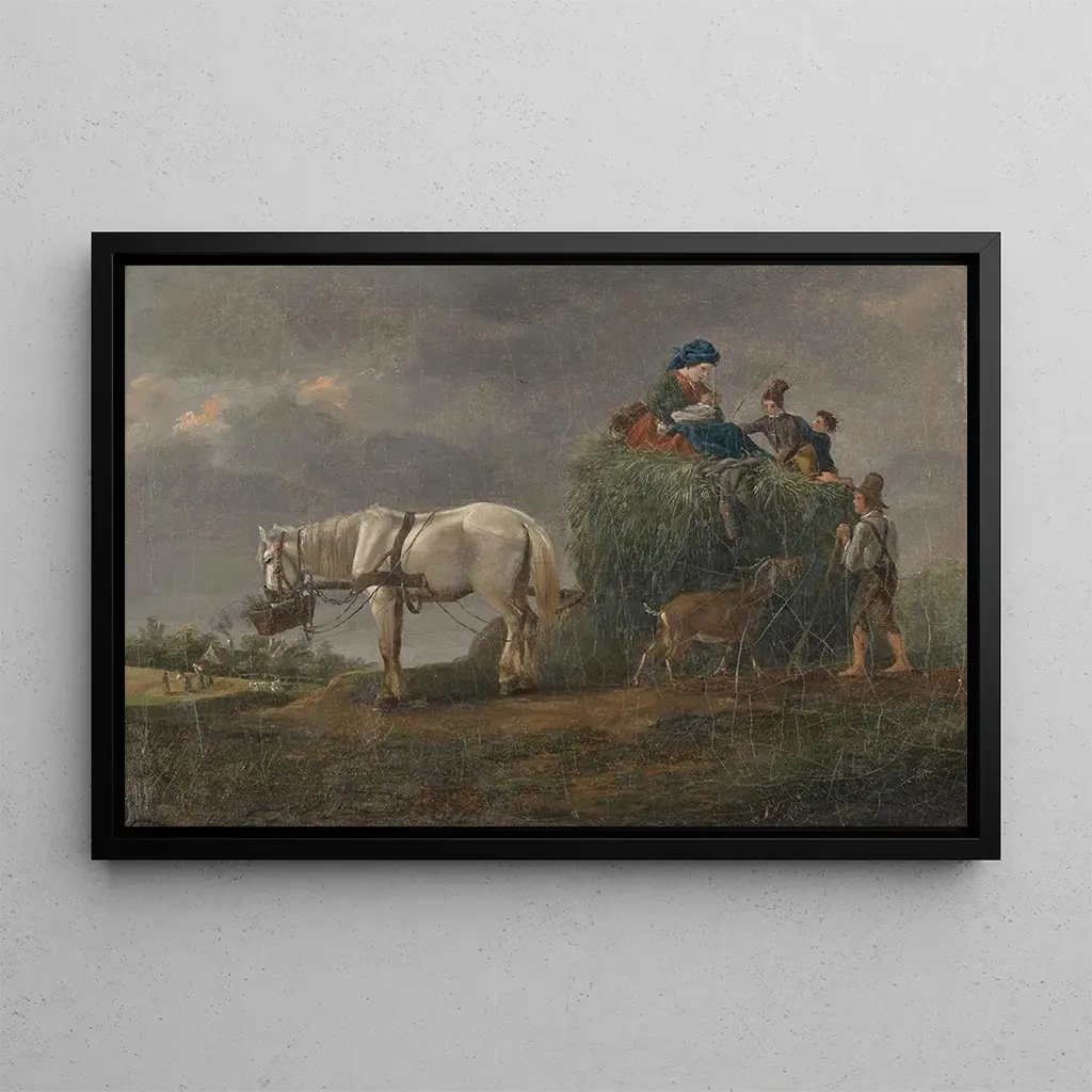 "La charrette de foin" est une reproduction qui capture l'essence même de la vie rurale au XIXe siècle. Ce tableau dépeint une scène animée où des paysans s'affairent autour d'une charrette chargée de foin, sous un ciel lumineux. Les couleurs chaudes, allant des bruns terreux aux verts éclatants, évoquent la richesse des paysages agricoles. La technique de peinture, caractérisée par des détails minutieux et une lumière douce, crée une atmosphère vivante et dynamique, invitant le spectateur à s'immerger dans cette vie simple et authentique.