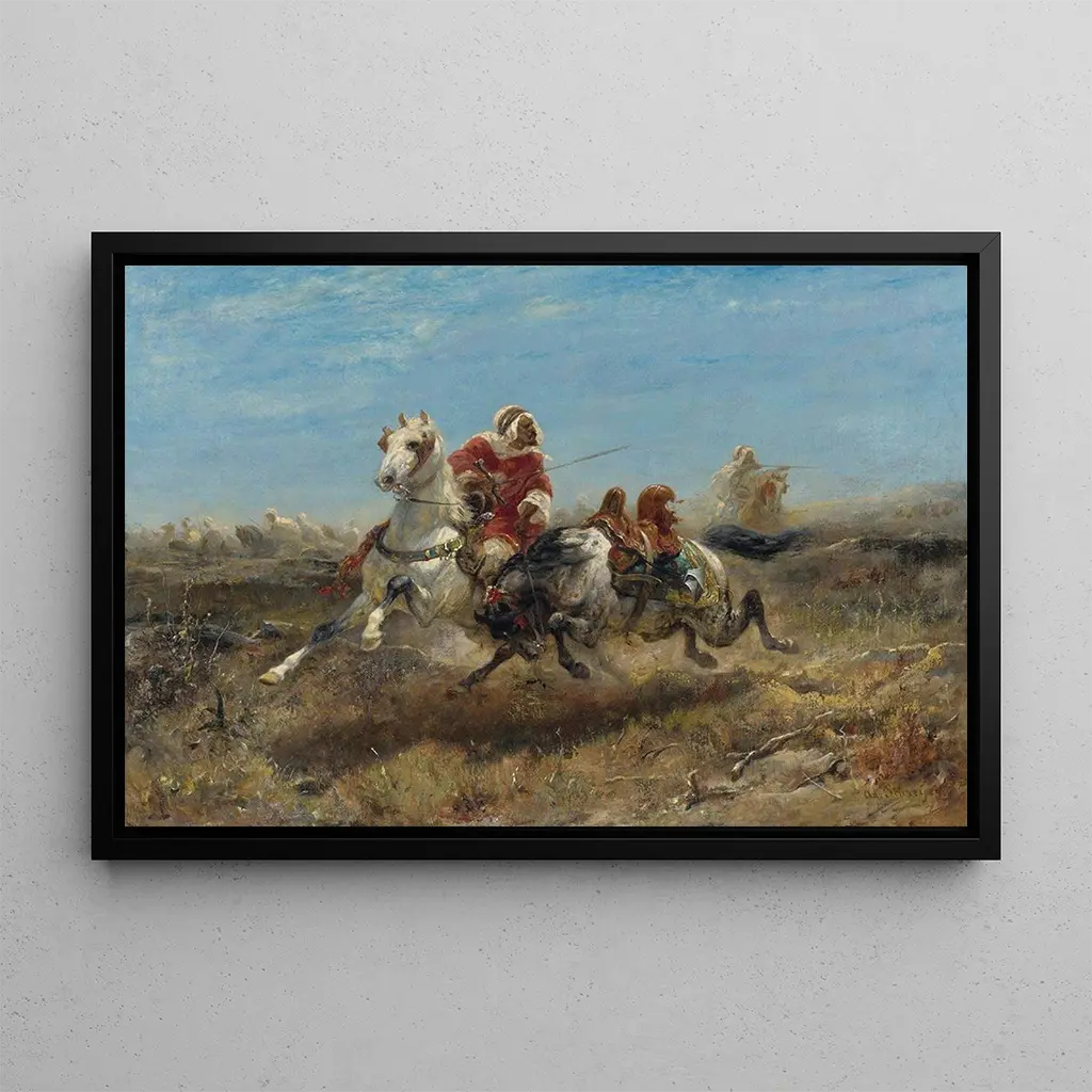 In "La Chasse," Adolf Schreyer immerses us in a lively scene where the wild nature unfolds in all its splendor. The animals, captured in a moment of tension, are depicted with remarkable accuracy, while the surrounding landscape, rich in detail, evokes an atmosphere that is both dynamic and majestic. The earthy colors and shades of green create a striking contrast, enhancing the intensity of the scene. This art print invites a complete immersion into the world of wildlife, where each gaze reveals a new facet of wild life.